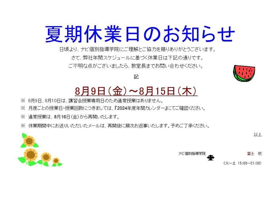 ナビ個別指導学院富士校です。夏期休業日のご案内になります。ナビ個別指導学院富士校は8/9(金)~8/15(木)まで夏期休業日となっております。期間中にいただきましたご連絡に関しましては8/16日以降に順次対応させていただきます。