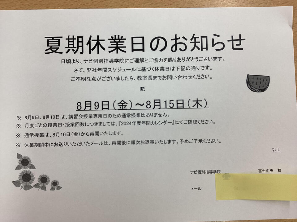 いつも【ナビ個別指導学院 富士中央校】をご利用いただきまして、誠にありがとうございます。