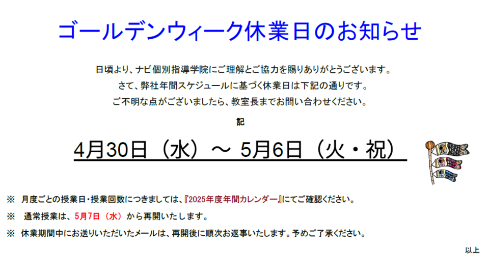 日頃より、ナビ個別指導学院にご理解とご協力を賜りありがとうございます。さて、弊社年間スケジュールに基づく休業日は下記の通りです。