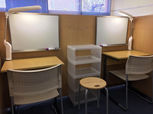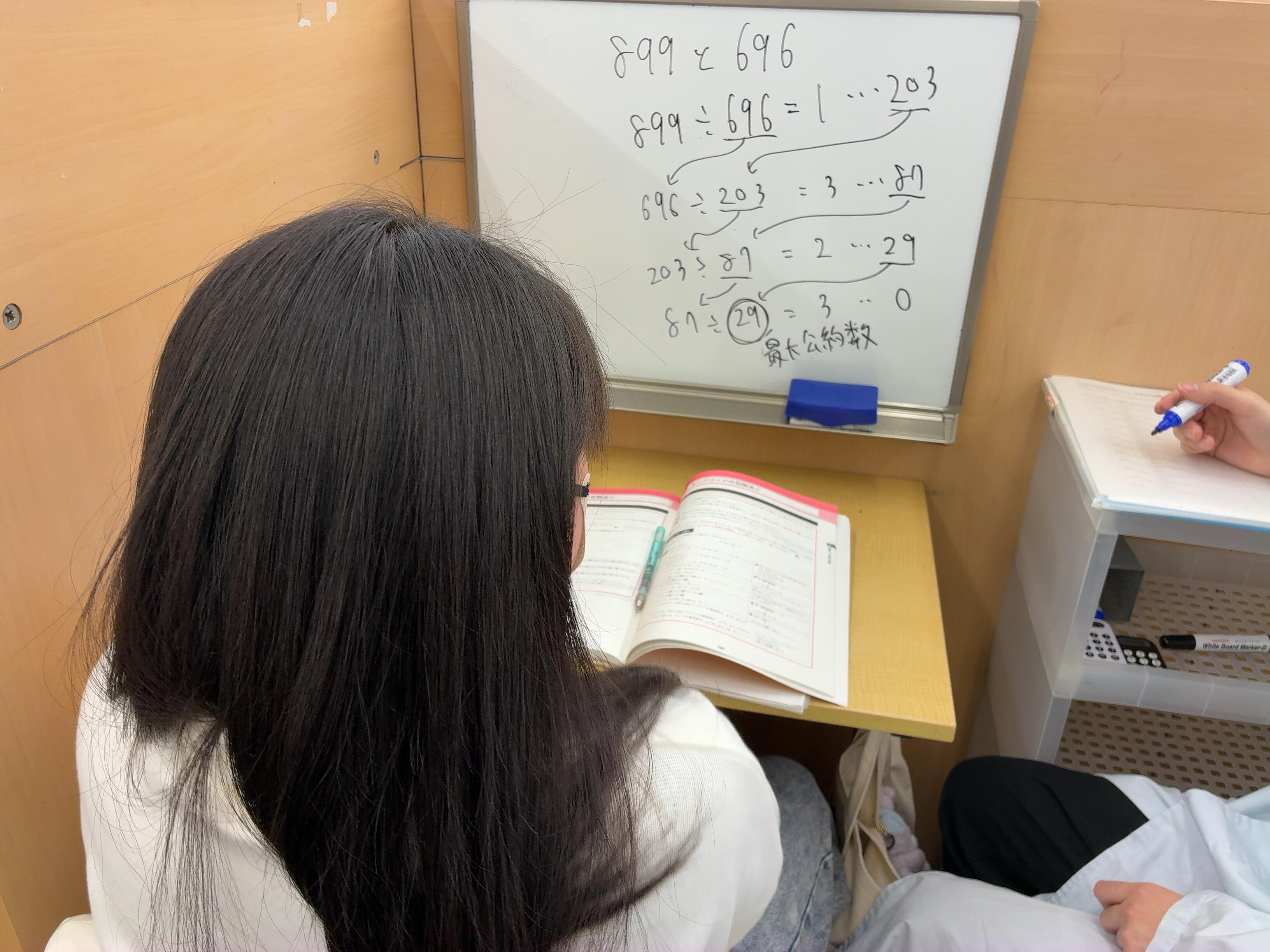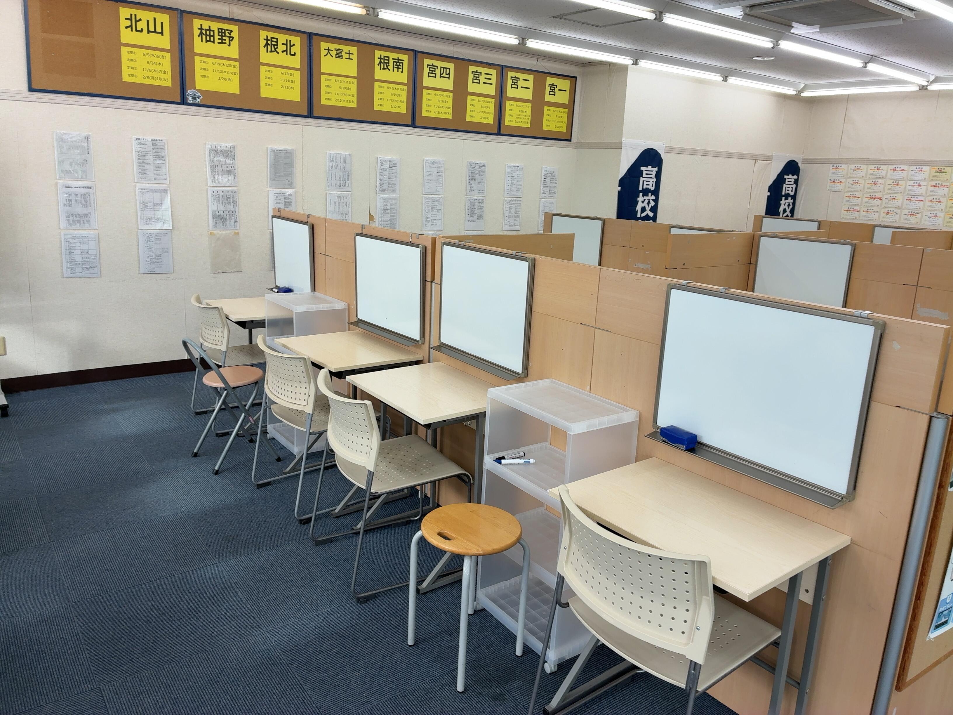 ナビ個別指導学院の授業は、個別の席ごとに設置された自分専用のホワイトボードで解き方や考え方を一緒に確認、それから生徒が問題を解くという「個別授業」スタイルです。