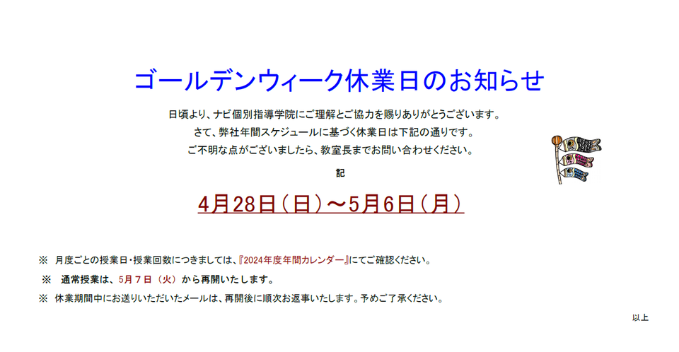 弊社年間スケジュールに基づく休業日は下記の通りです。GW休業日 4月28日(日)~5月6日(月)5月7日(火)より通常授業を再開いたします。※月度ごとの授業日・授業回数につきましては、『2024年度年間カレンダー』にてご確認ください。※休業期間中にお送りいただいたメールは、再開後に順次お返事いたします。予めご了承ください。