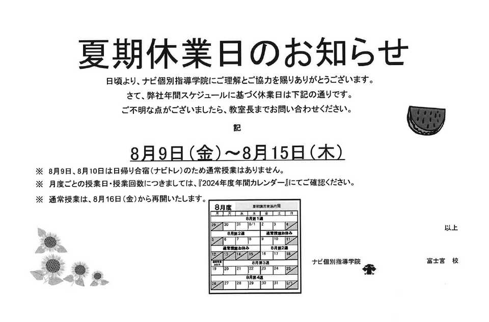 いつも【ナビ個別指導学院 富士宮校】をご利用いただきまして、誠にありがとうございます。