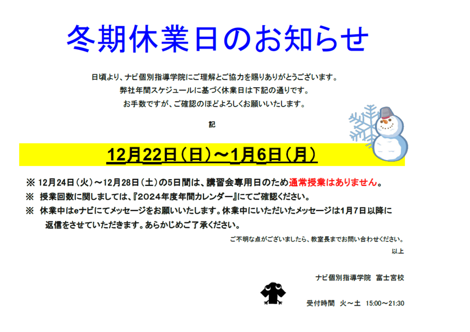 ※会員様におかれましては、通常授業、冬期講習授業の日程など年間カレンダーや生徒様個別の時間割表などご確認いただければ幸いです。