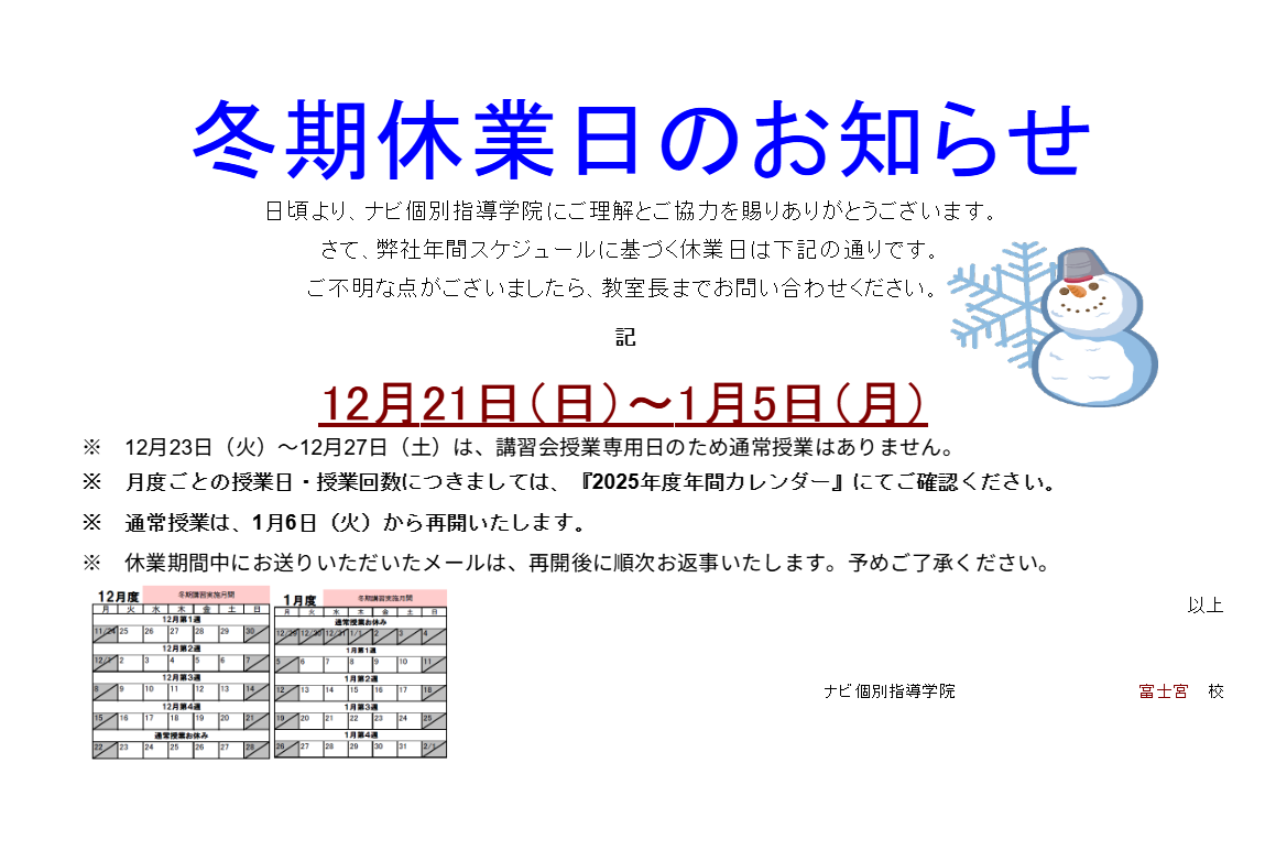 ※会員様におかれましては、通常授業、冬期講習授業の日程など年間カレンダーや生徒様個別の時間割表などご確認いただければ幸いです。