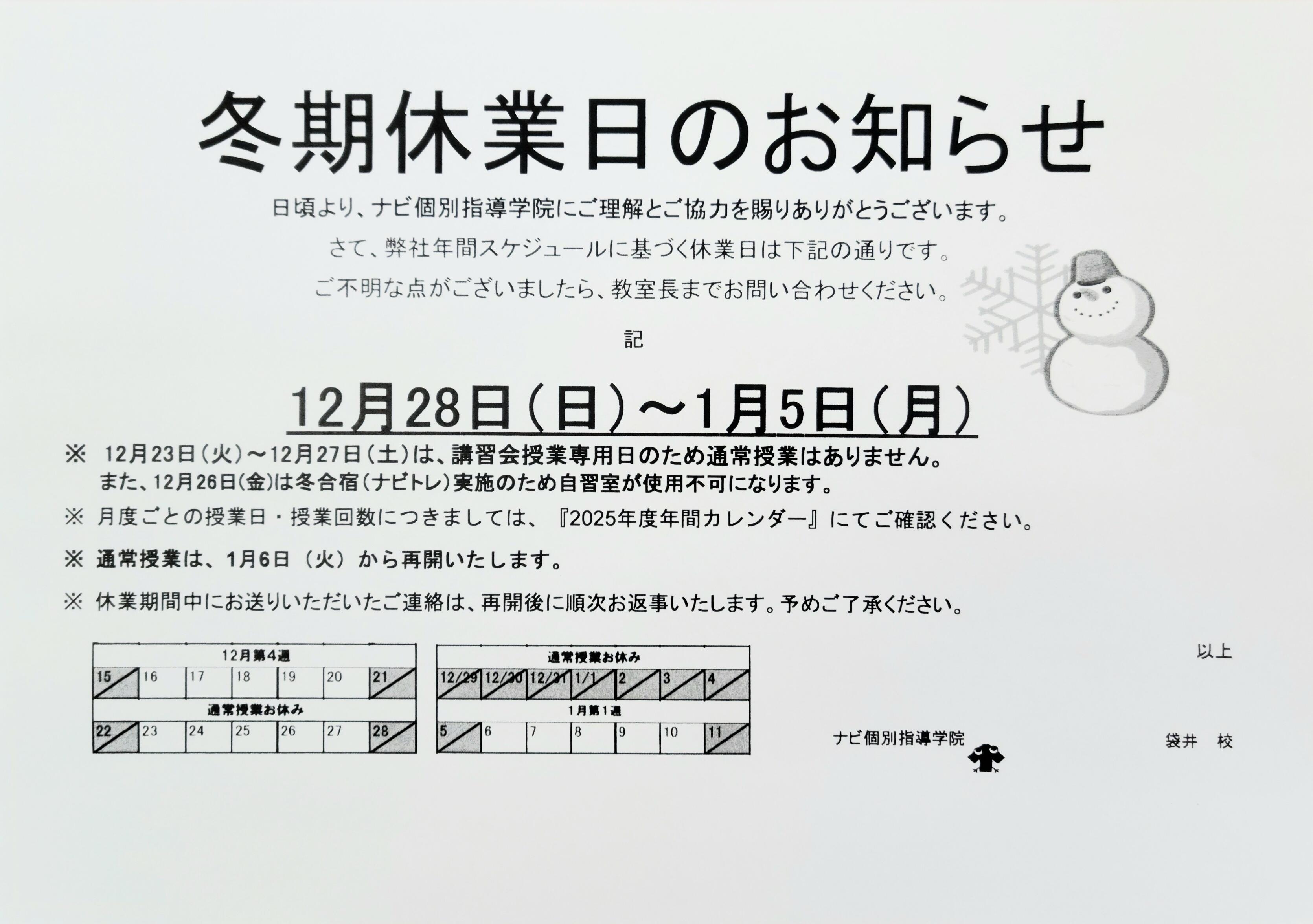 冬期休業日 12月28日(日)から1月5日(月)