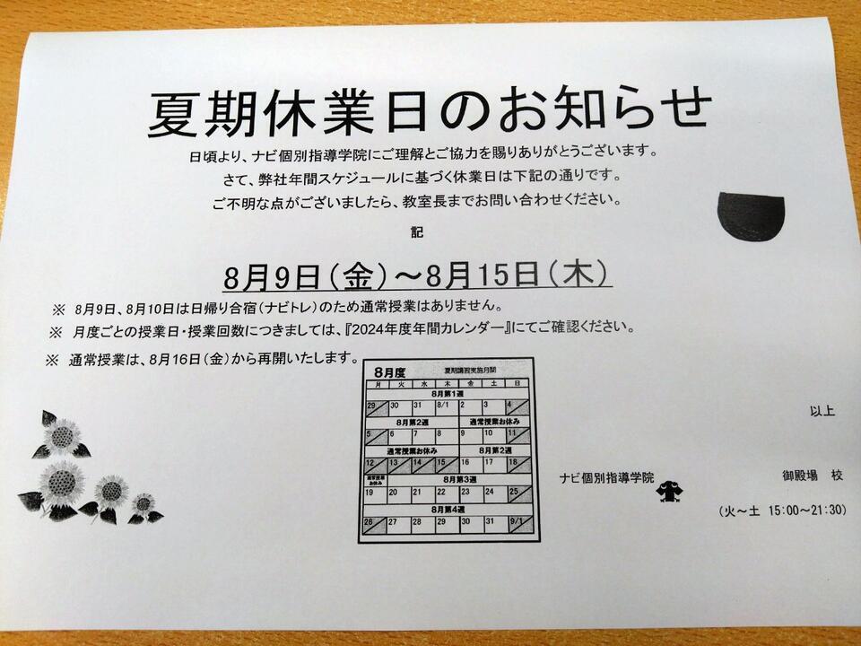 さて、弊社年間スケジュールに基づく休業日により8月11日日曜日より8月15日木曜日は夏期休業となります。通常授業の再開は8月16日金曜日です。