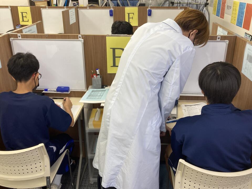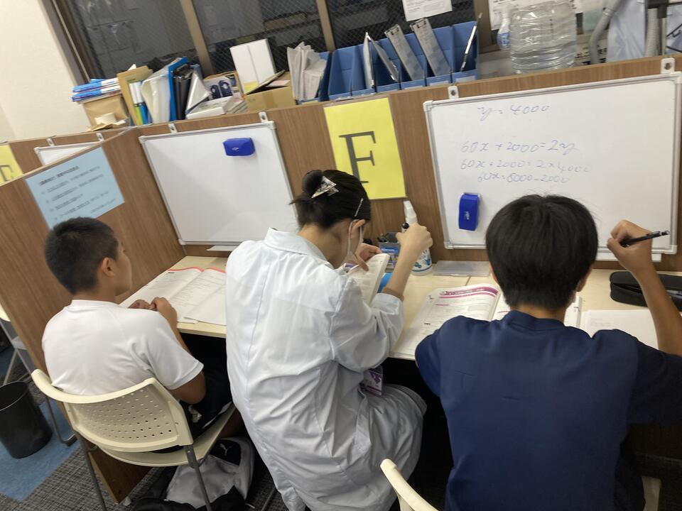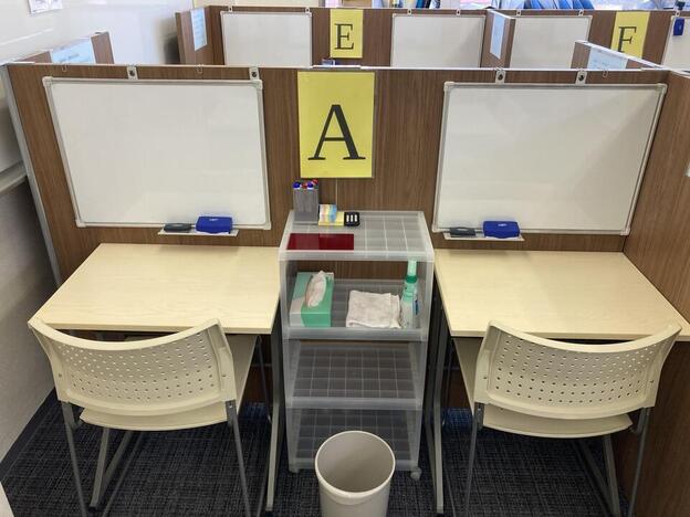 ナビ個別指導学院の授業は、個別の席ごとに設置された自分専用のホワイトボードで解き方や考え方を一緒に確認、それから生徒が問題を解くという「個別授業」スタイルです。