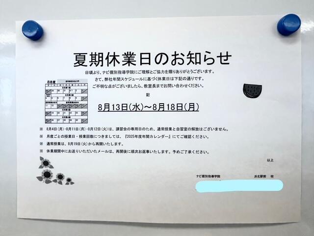 8月13日(水)~18日(月)は塾の夏期休業期間になります。