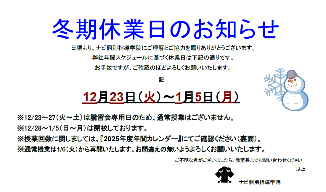 ※12/23(火)~27(土)は開校しておりますが、講習会や入試対策講座、ご案内のあった振替授業のみとなります。