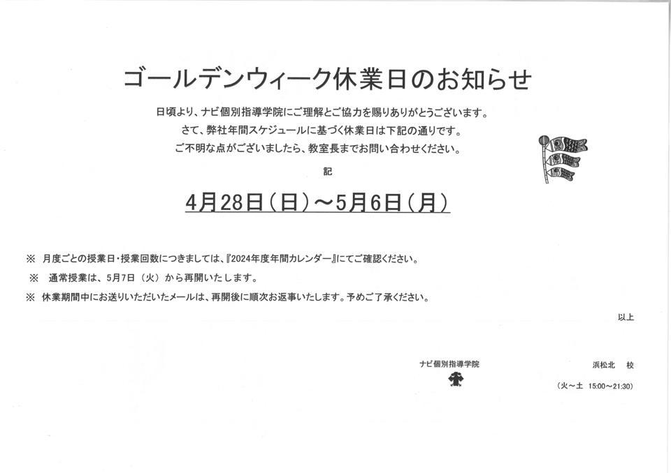 ゴールデンウィーク休業日のお知らせ日頃より、ナビ個別指導学院にご理解とご協力を賜りありがとうございます。さて、弊社年間スケジュールに基づく休業日は下記の通りです。