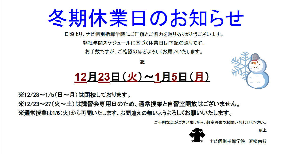 ※12月23日(火)から12月27日(土)に関しましては、講習会専用日の為、通常授業はお休みです。