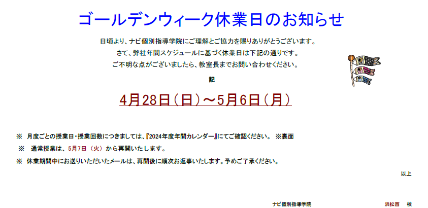 4/28(日)~5/6(月)のあいだ、ナビ個別指導学院はGW休業となります。