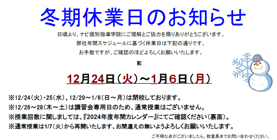 ※12/26~28(木~土)の開校は、講習や入試対策講座・合宿・ご案内のあった振替授業のみとなります。