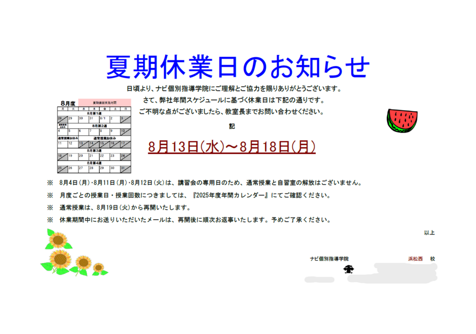 夏期休業日(完全閉校):8月13日(水)~8月18日(月)