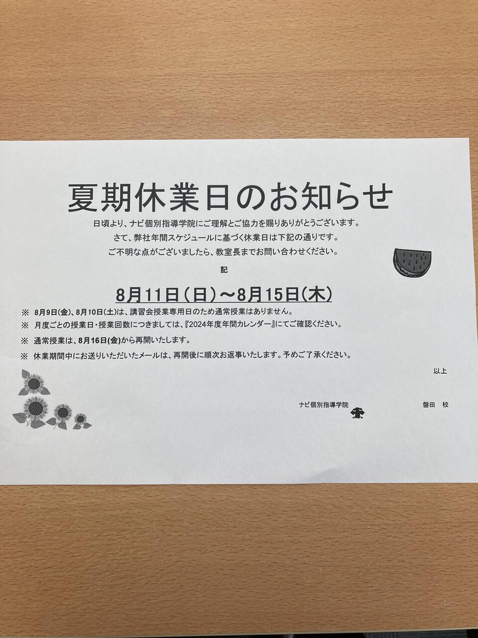 本日はナビ個別指導学院 磐田校の夏期休業についてお知らせします。