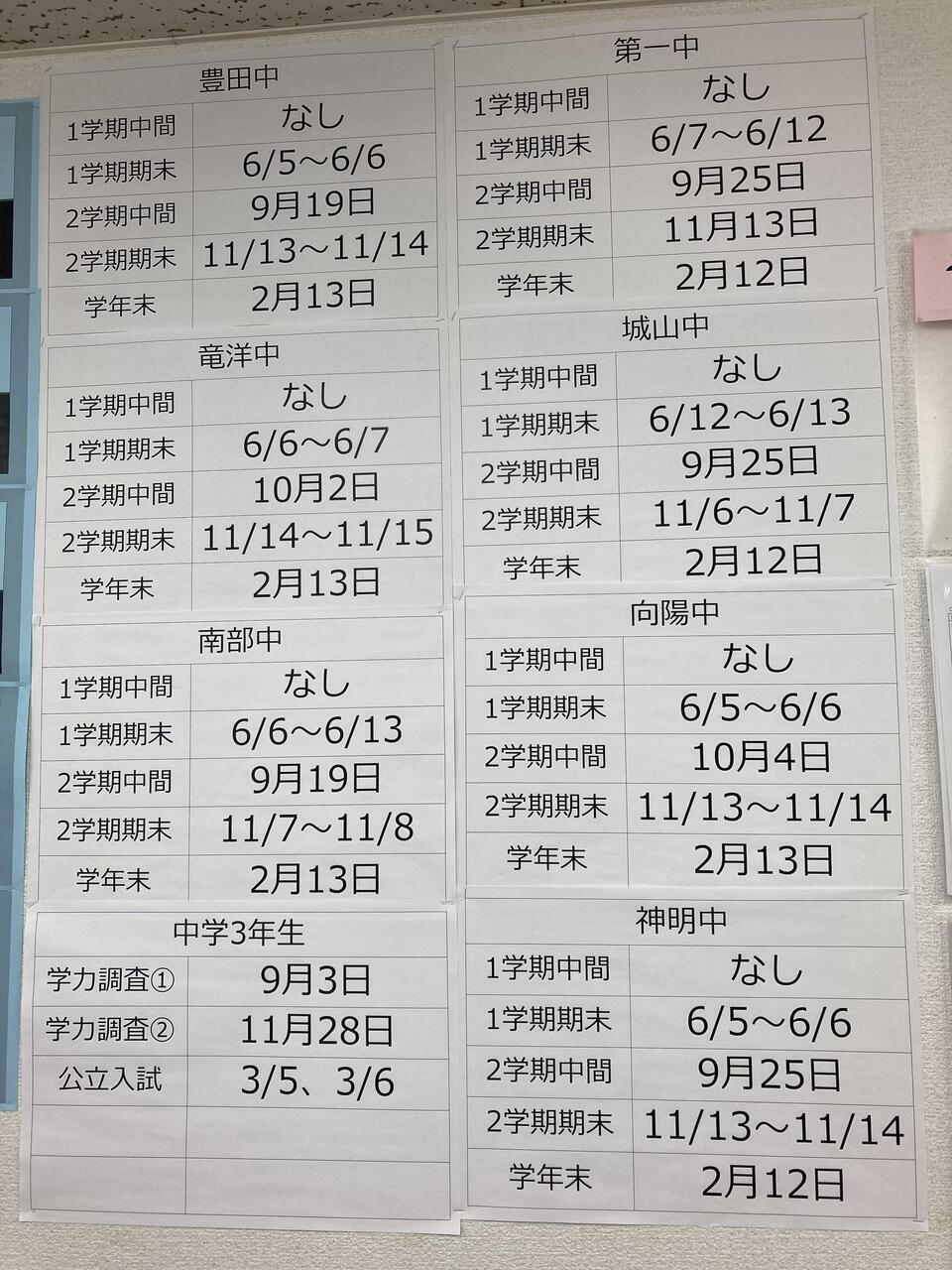 中学生の中間テストですが、磐田南部中・豊田中は9/19に実施ですね。