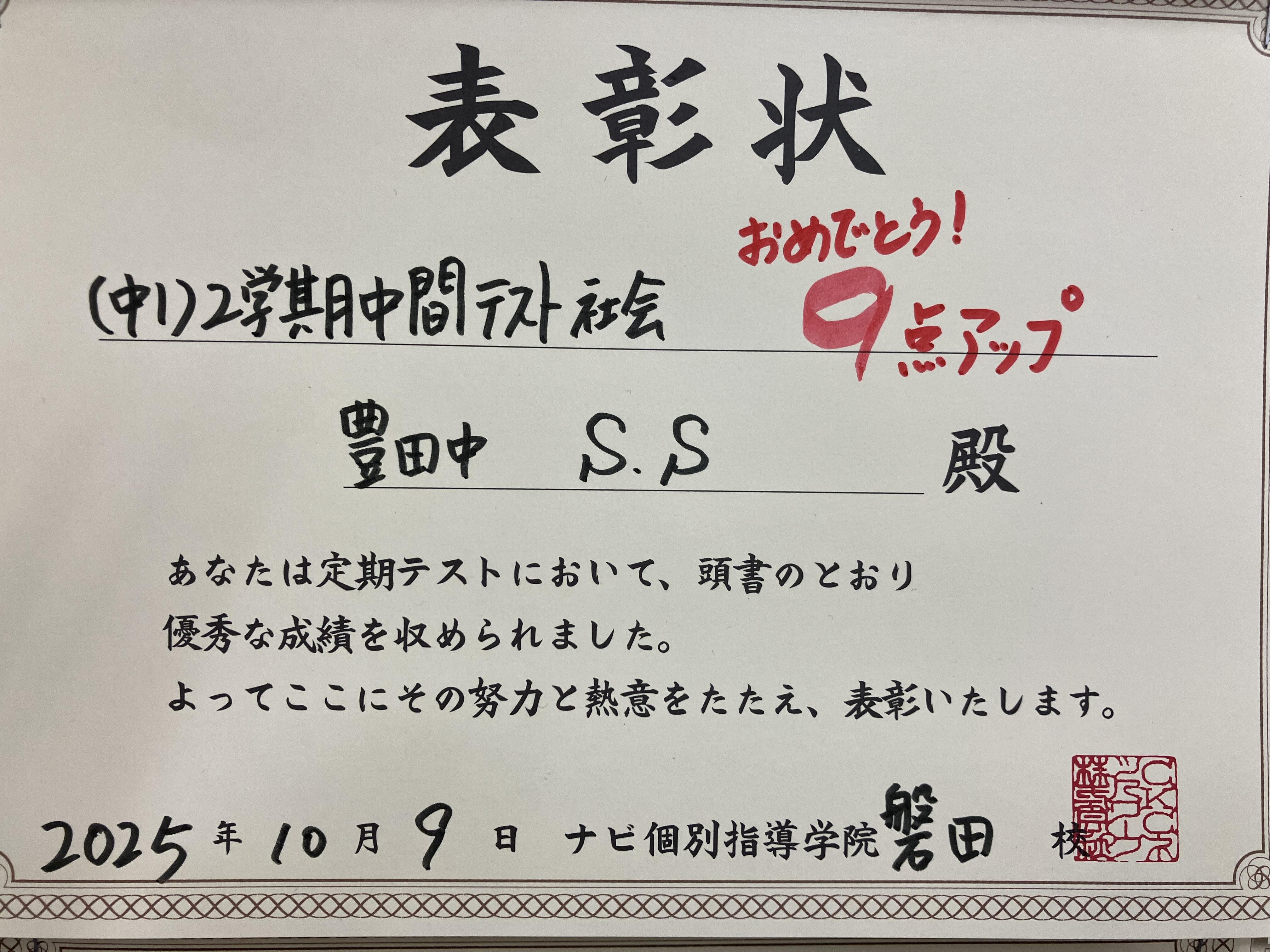9月に行われた2学期中間テストの健闘者のご紹介です♪