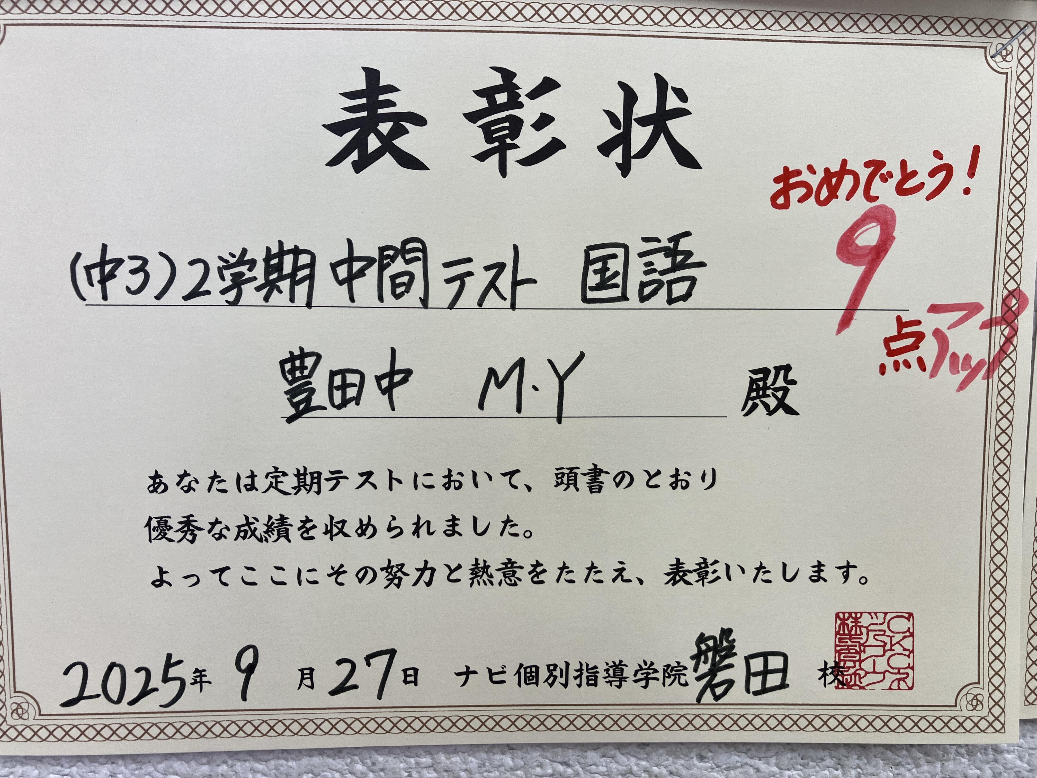 9月に行われた2学期中間テストの健闘者のご紹介です♪