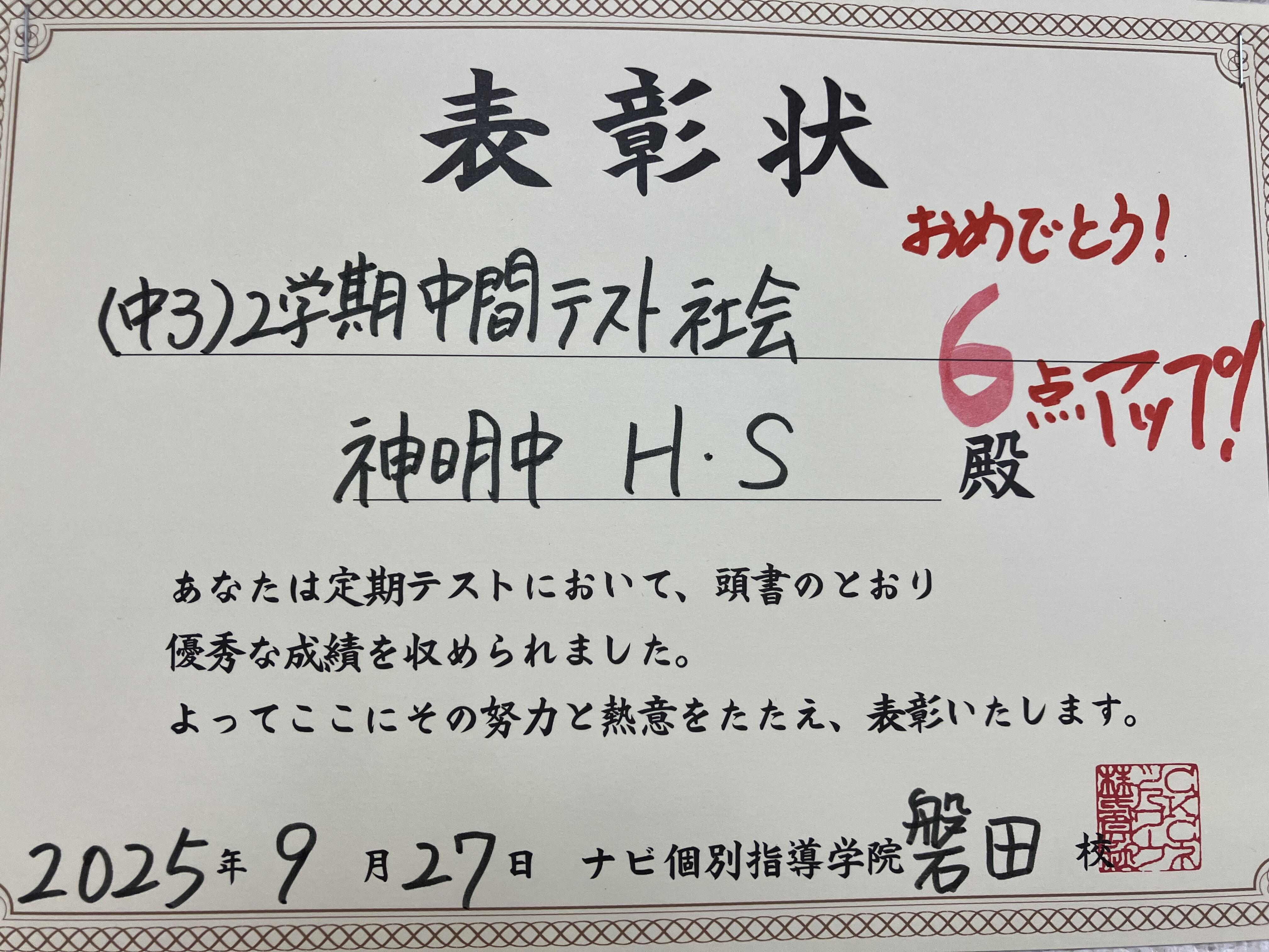 2学期中間テストよく頑張りました、おめでとう!!11月中旬にある2学期期末のテストへ向けて、これからも一緒に頑張りましょう♪
