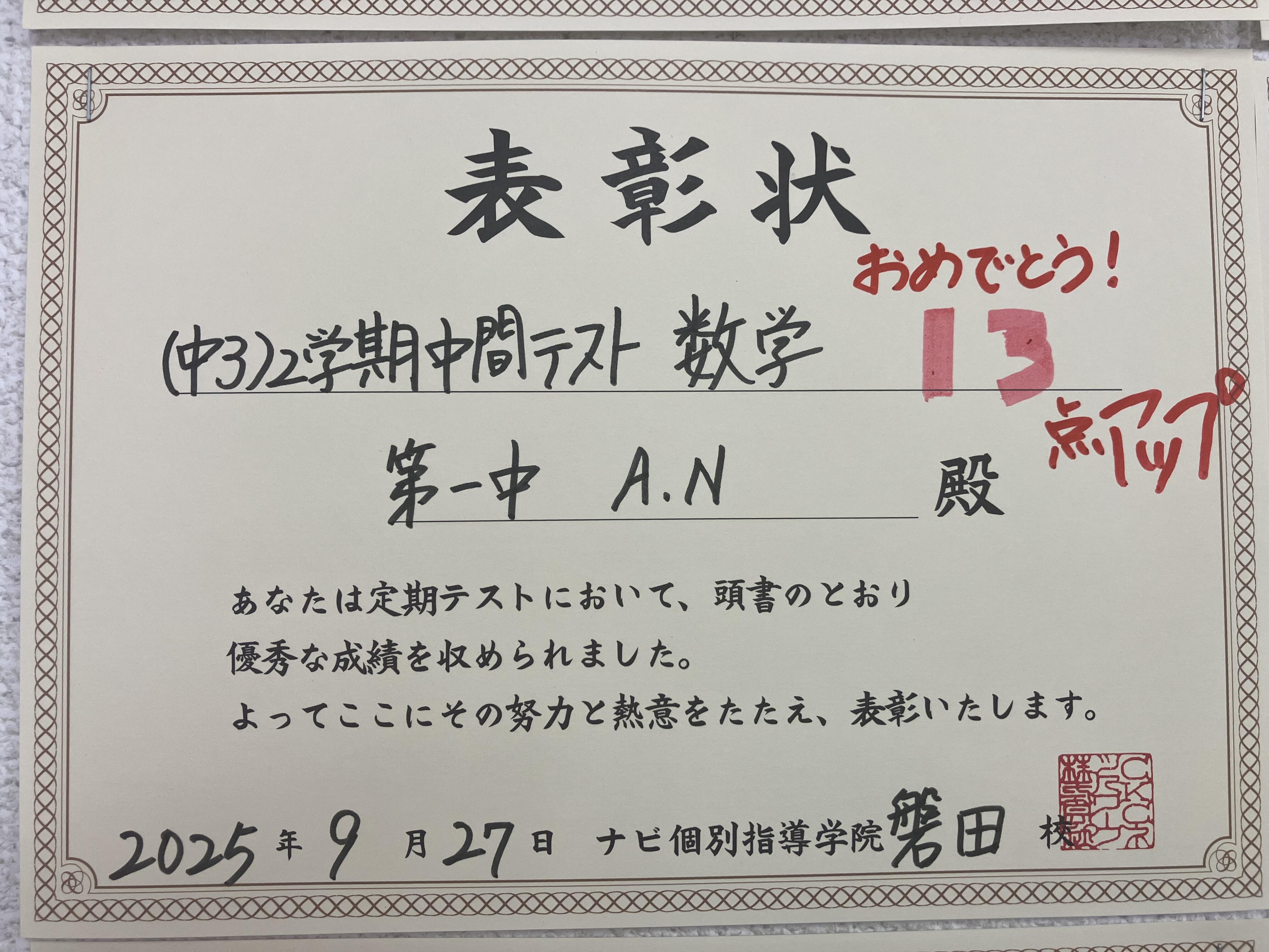 2学期中間テストよく頑張りました、おめでとう!!