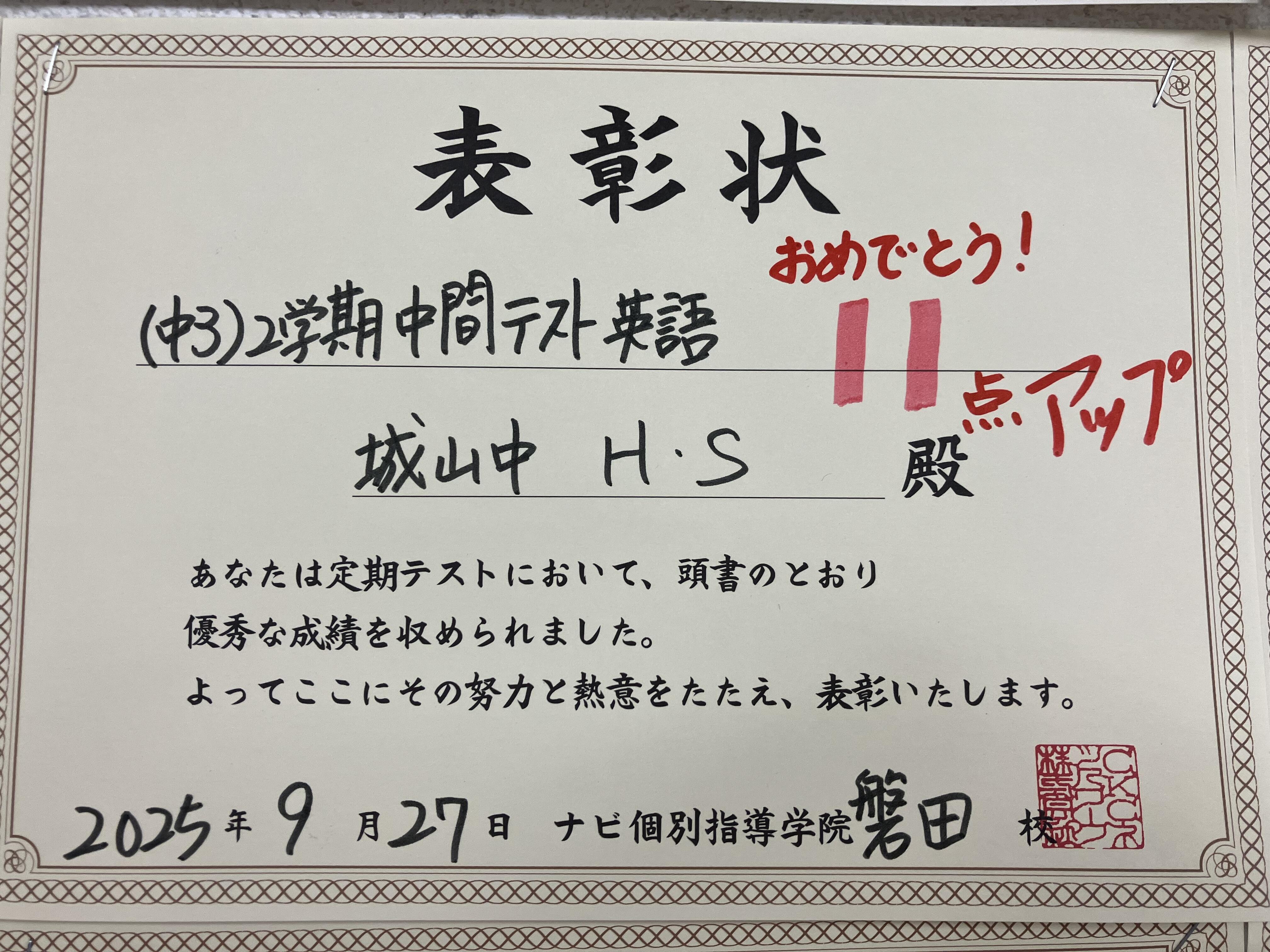 2学期中間テストよく頑張りました、おめでとう!!11月中旬にある2学期期末のテストへ向けて、これからも一緒に頑張りましょう♪