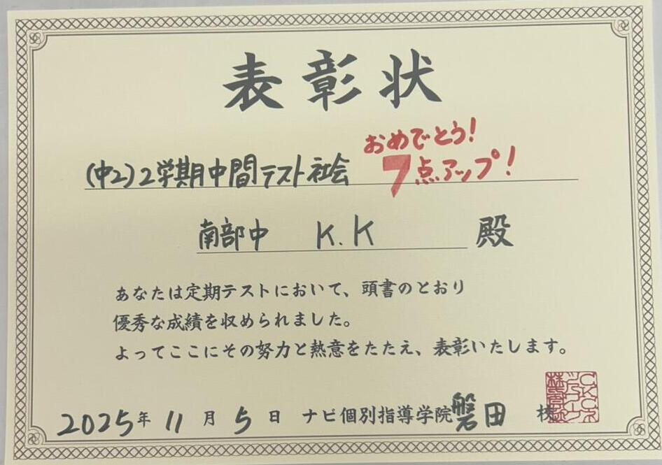 9月に行われた2学期中間テストの健闘者のご紹介です♪