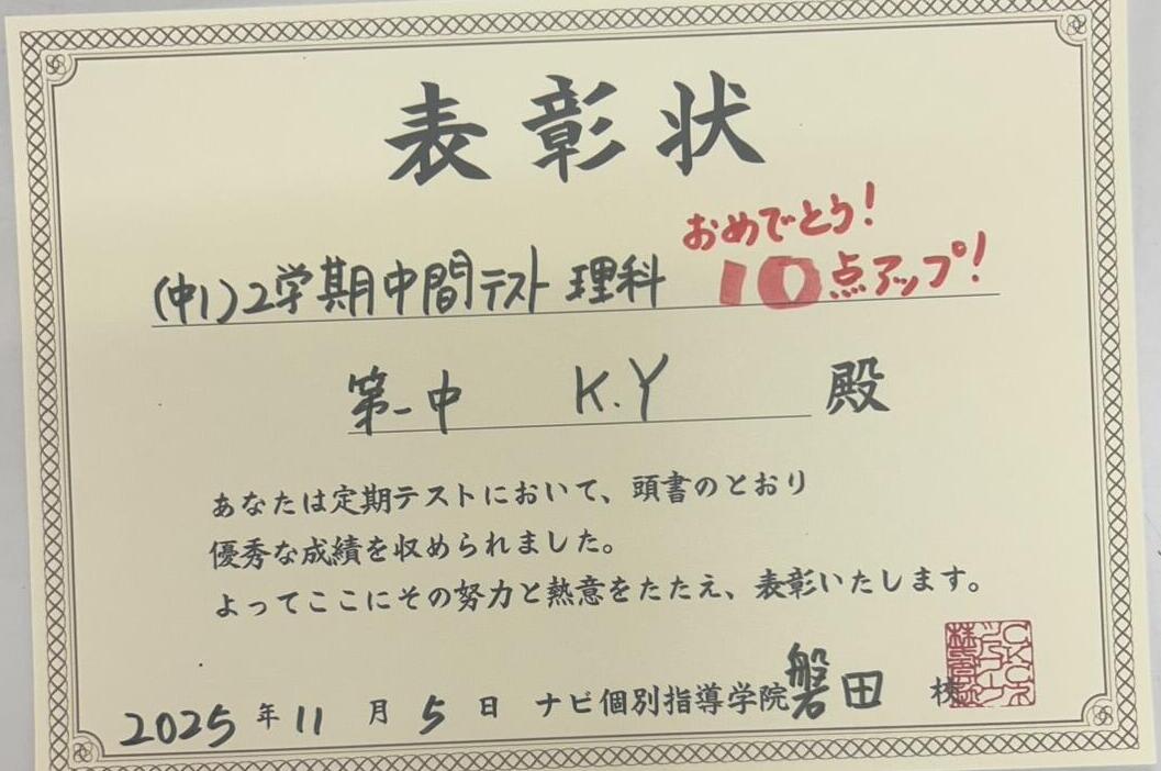 9月に行われた2学期中間テストの健闘者のご紹介です♪