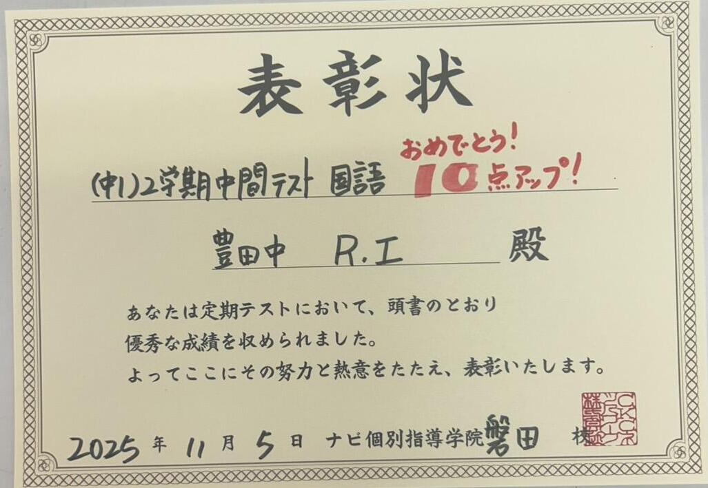 9月に行われた2学期中間テストの健闘者のご紹介です♪