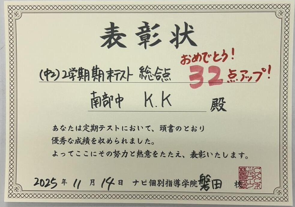 11月に行われた2学期期末テストの健闘者のご紹介です♪