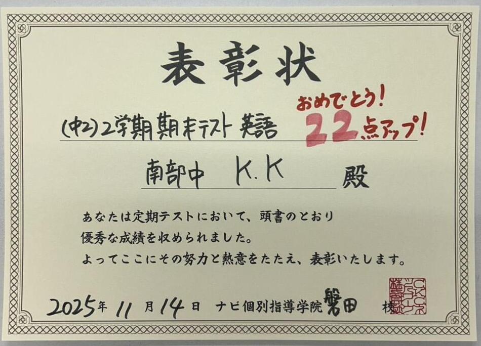 11月に行われた2学期期末テストの健闘者のご紹介です♪