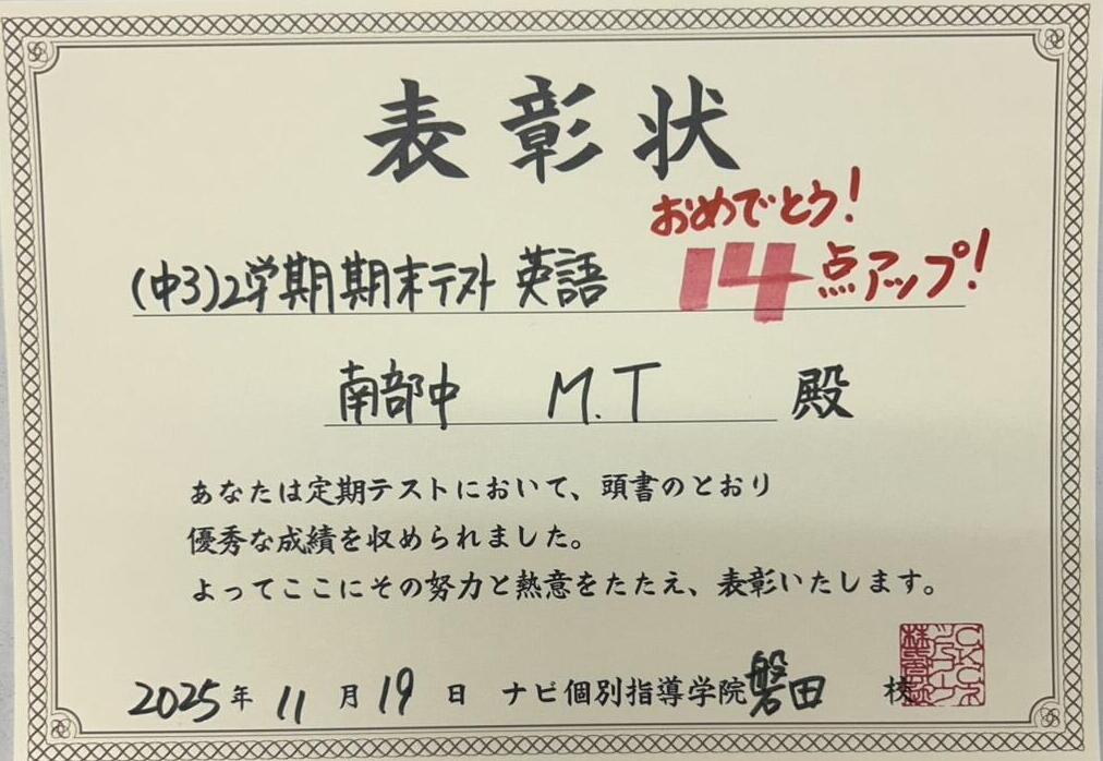 11月に行われた2学期期末テストの健闘者のご紹介です♪