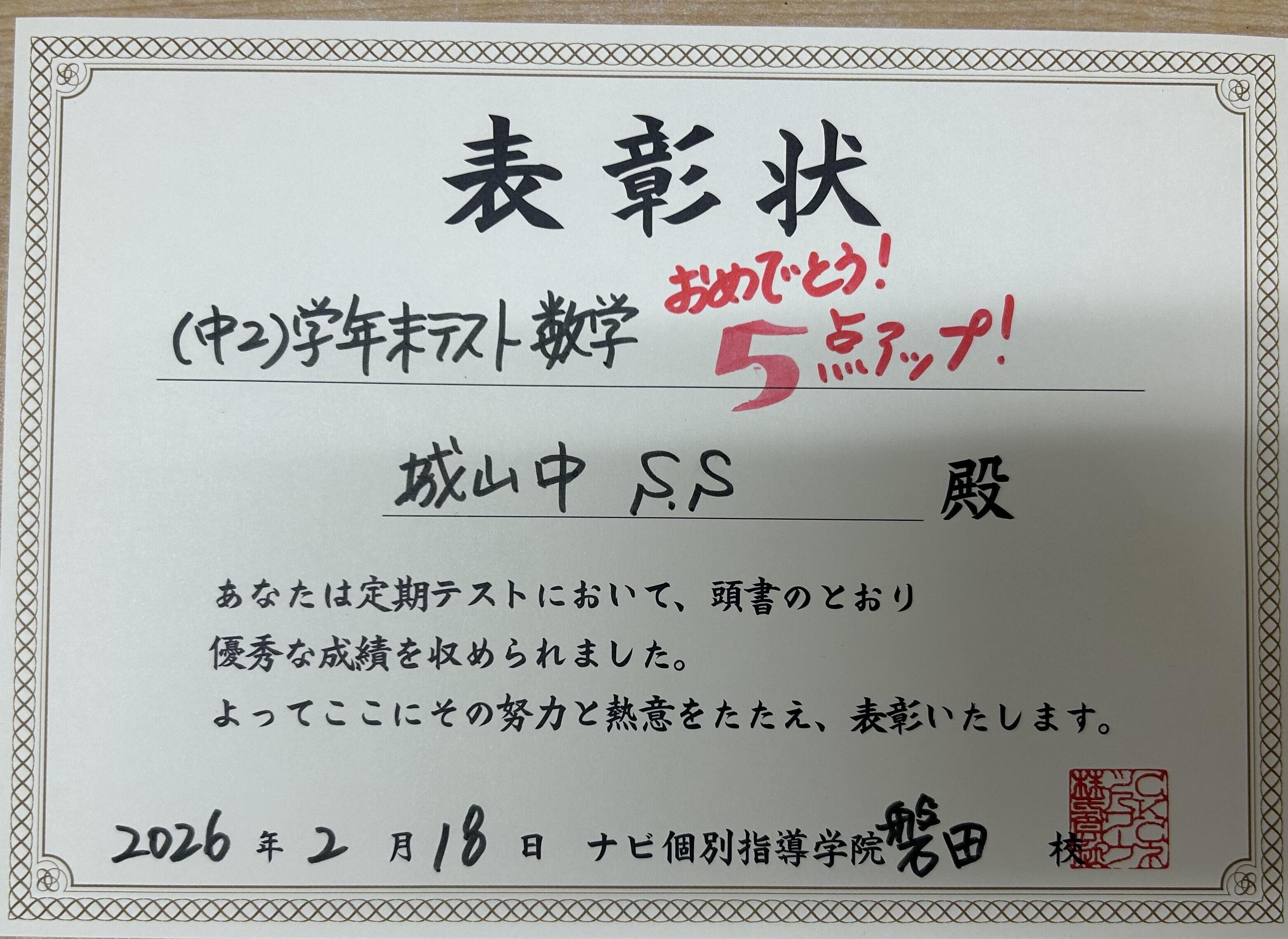 定期テスト健闘者(前回より〇点UP)♪【2/26】