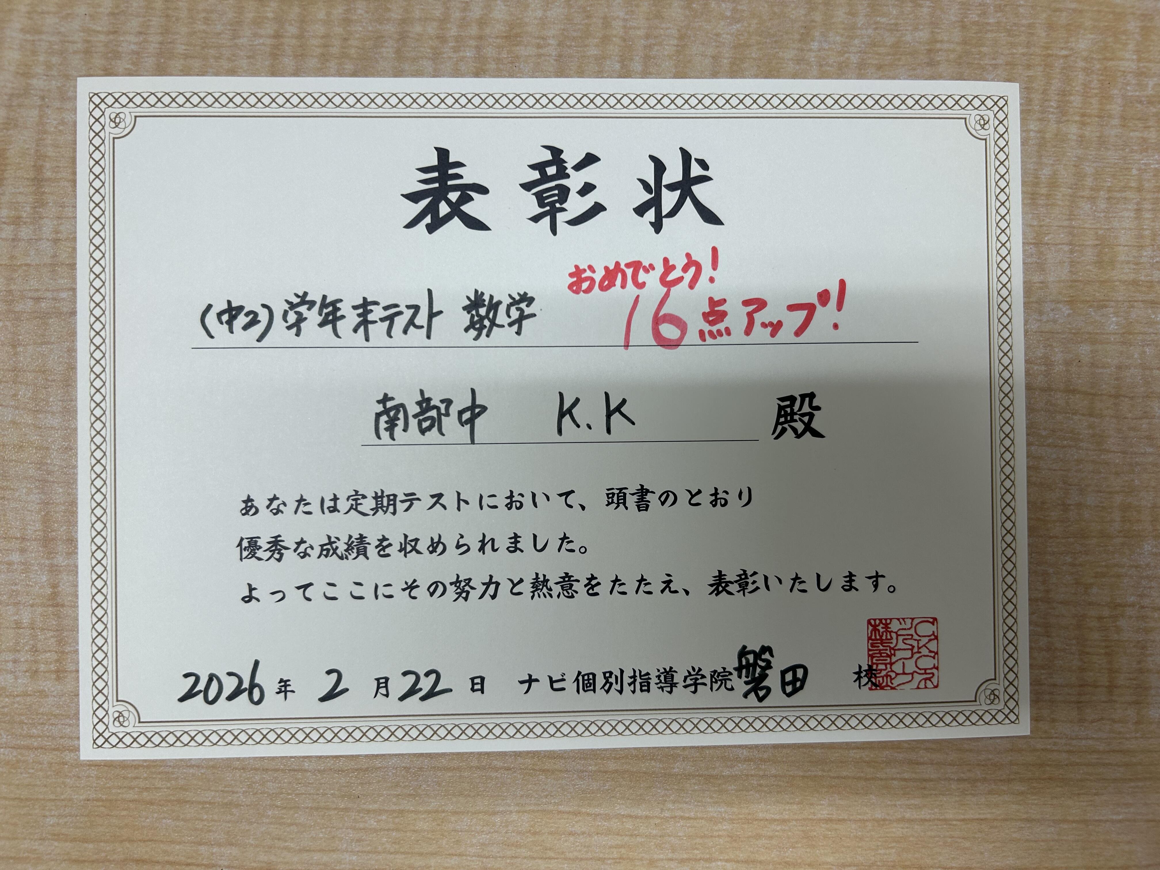 学年末テストよく頑張りました、おめでとう!!