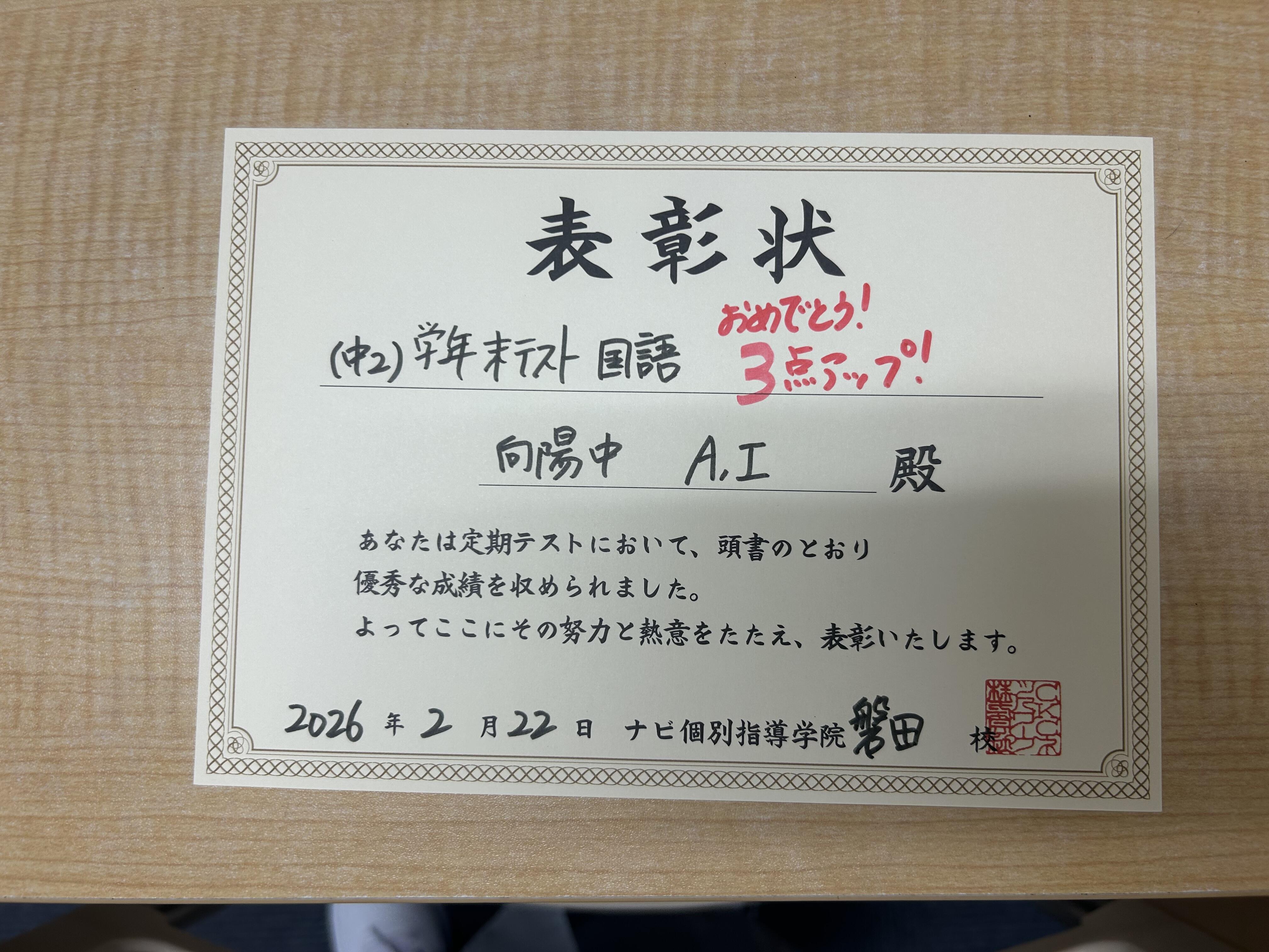 学年末テストよく頑張りました、おめでとう!!
