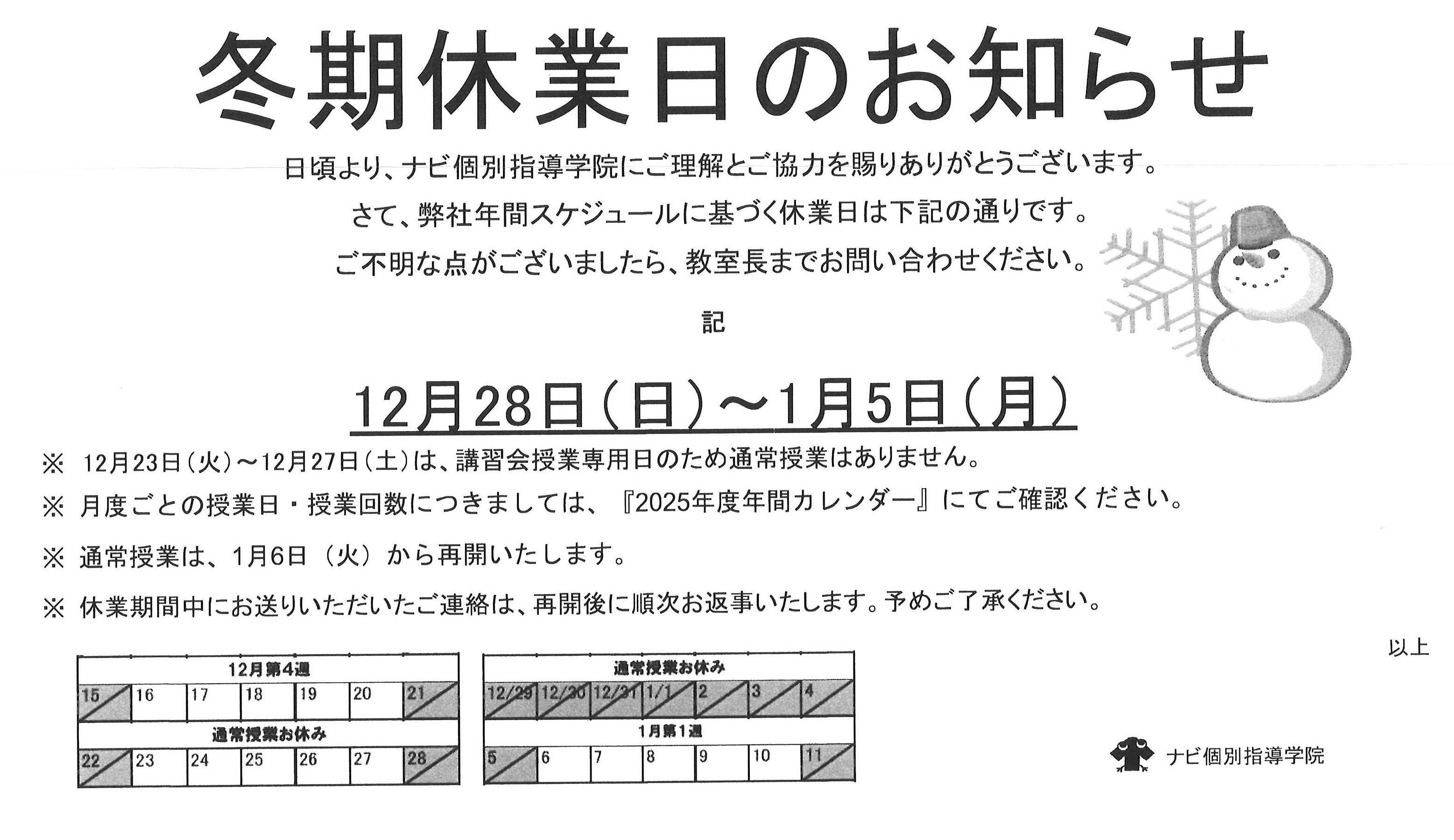 冬期休業日 12月28日(日)から1月5日(月)