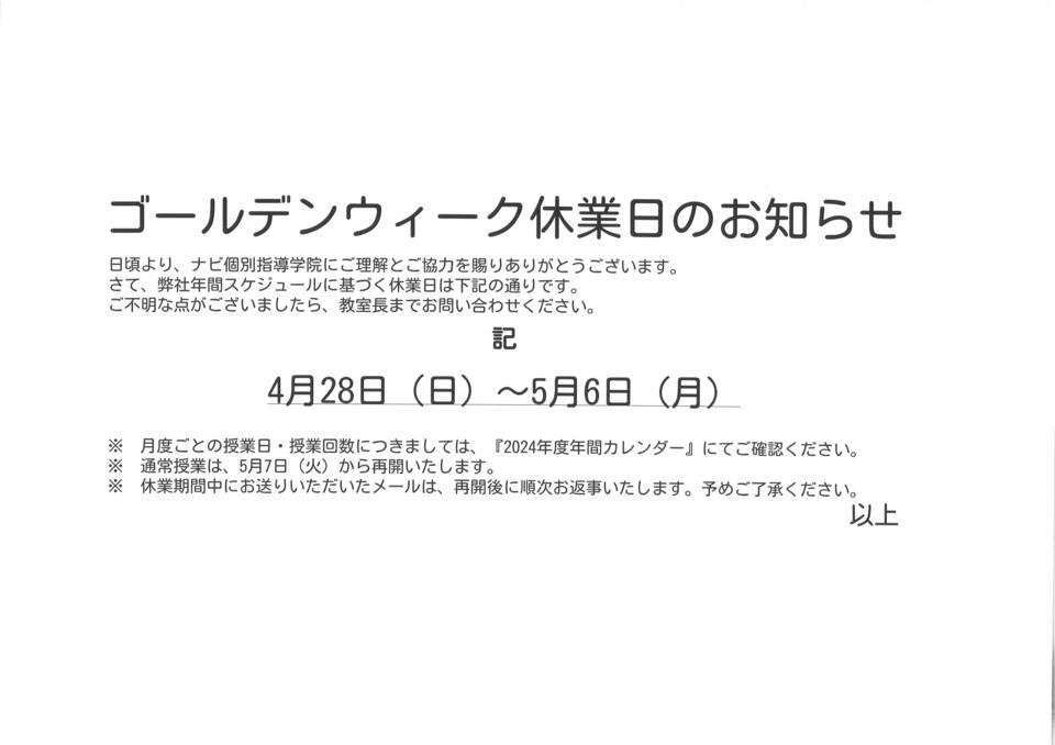 下記の日時におきまして、ナビ三方原校はGW休業日となっております。4月28日(日) ~ 5月6日(月)5月7日(火)より、通常通り営業を再開させていただきます。ご不便をお掛けし誠に申し訳ございませんが、よろしくお願い申し上げます。