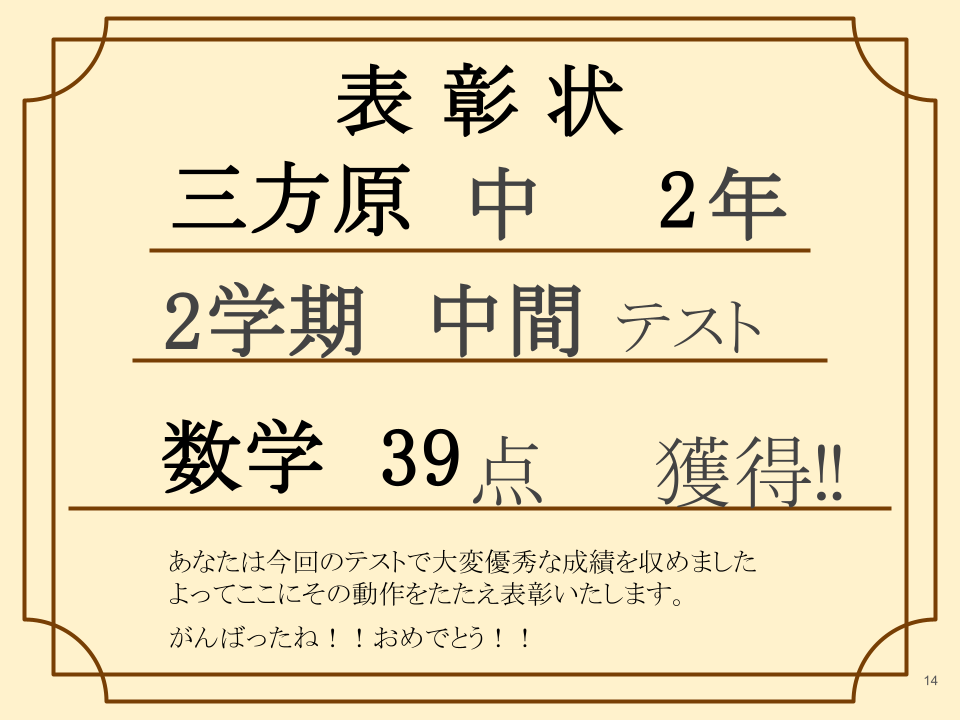 なんと2学期 中間テスト 数学39 点!!(※50点満点)