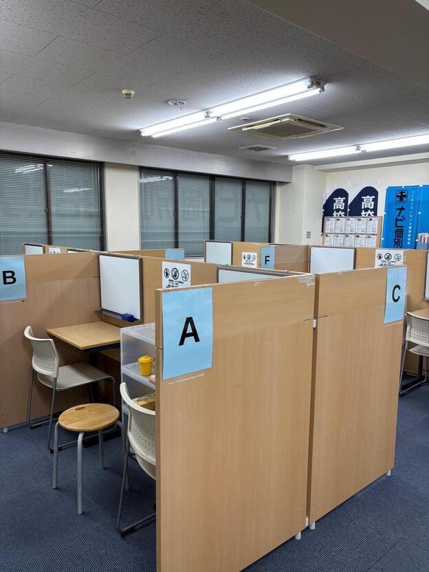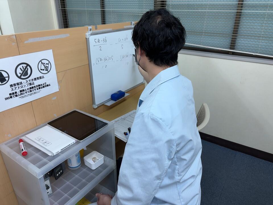 ナビ個別指導学院の授業は、個別の席ごとに設置された自分専用のホワイトボードで解き方や考え方を一緒に確認、それから生徒が問題を解くという「個別授業」スタイルです。