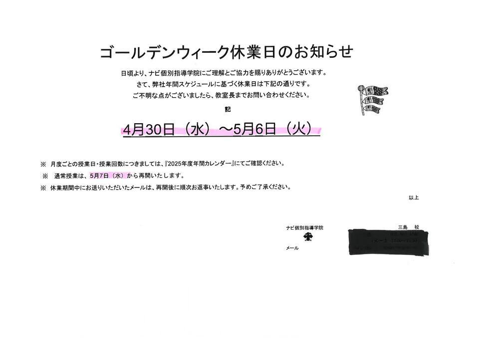 日頃より、ナビ個別指導学院にご理解とご協力を賜りありがとうございます。
