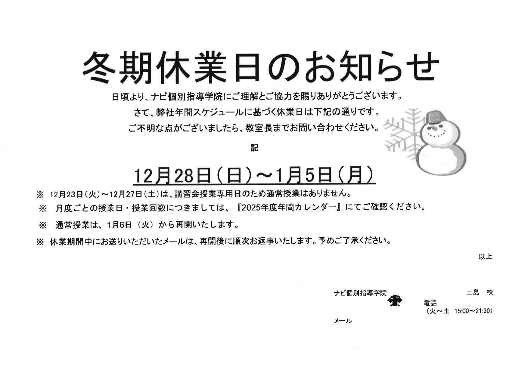 冬期休業日 12月28日(日)から1月5日(月)