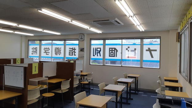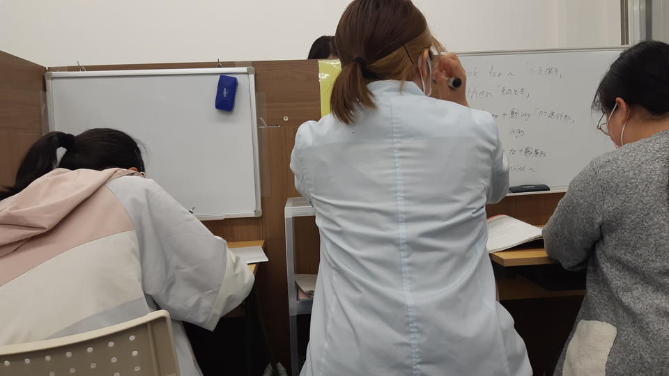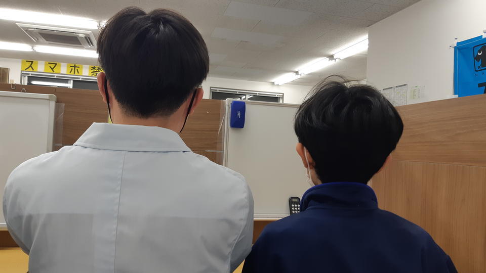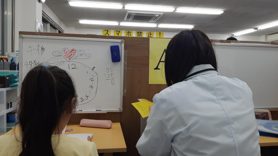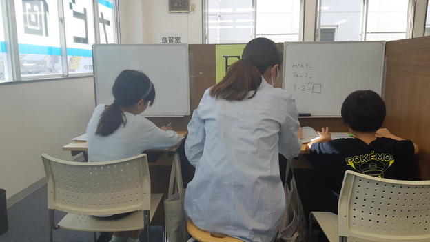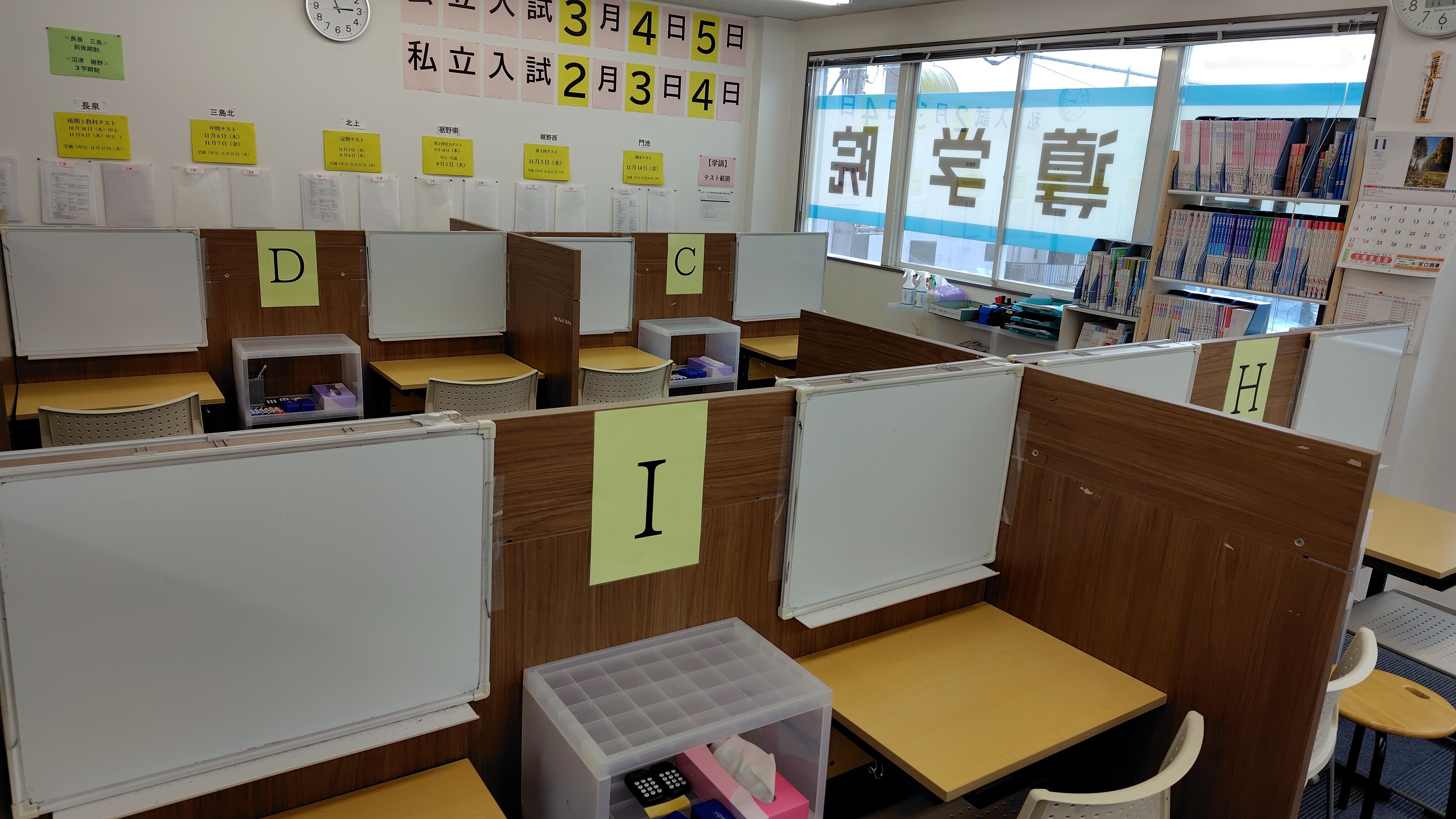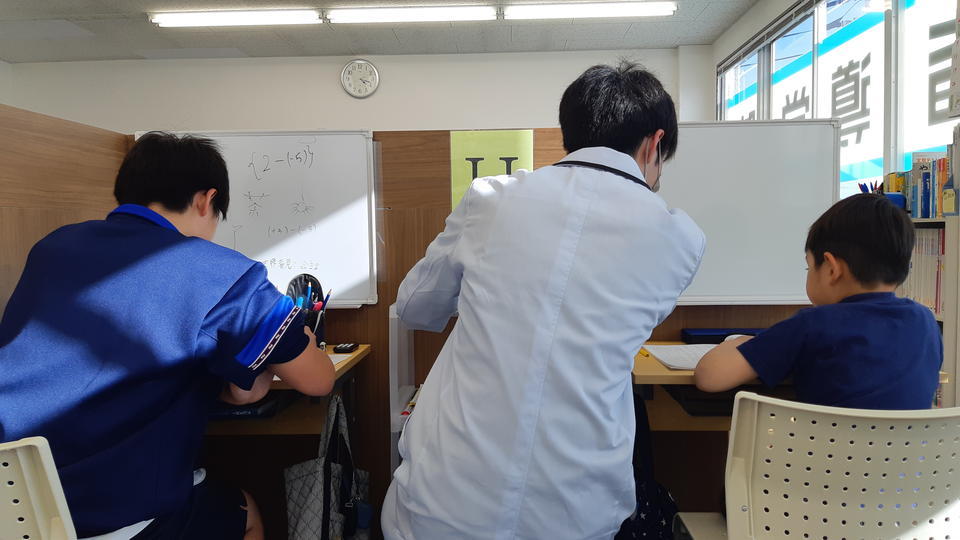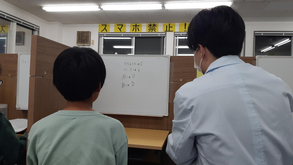 ナビ個別指導学院の授業は、個別の席ごとに設置された自分専用のホワイトボードで解き方や考え方を一緒に確認、それから生徒が問題を解くという「個別授業」スタイルです。