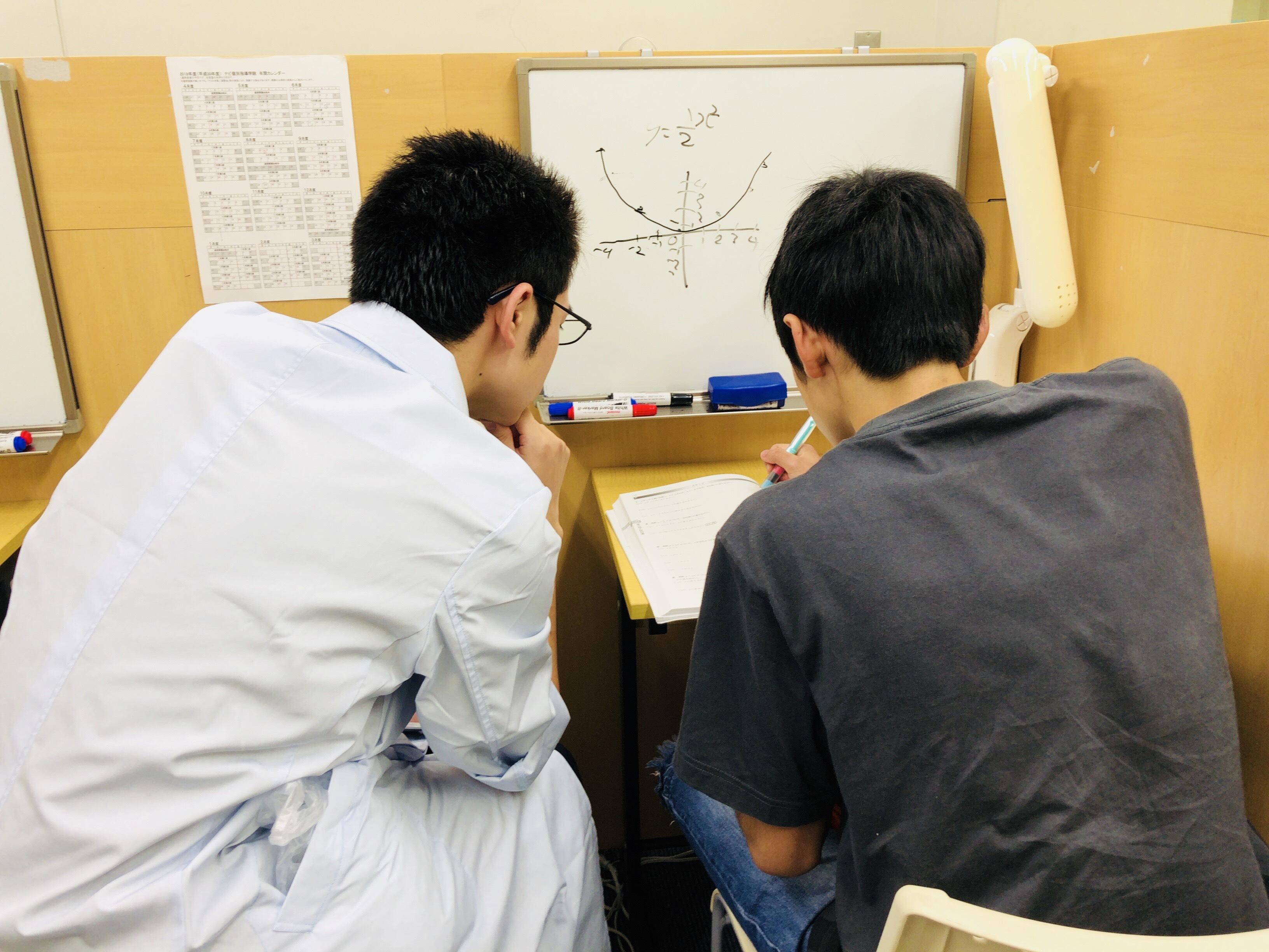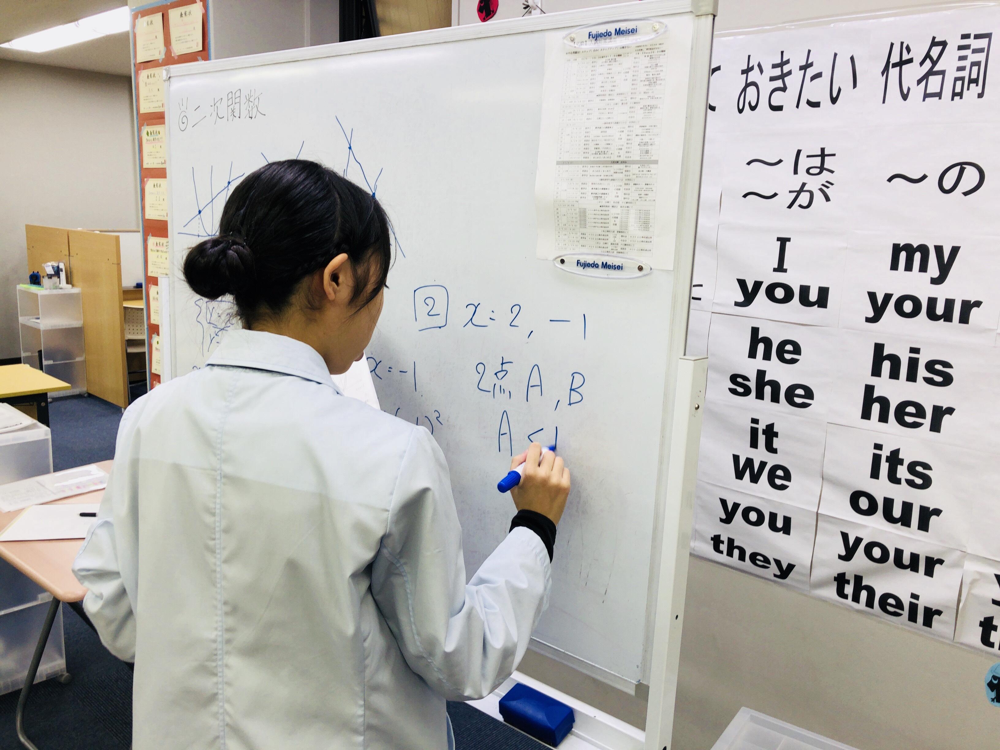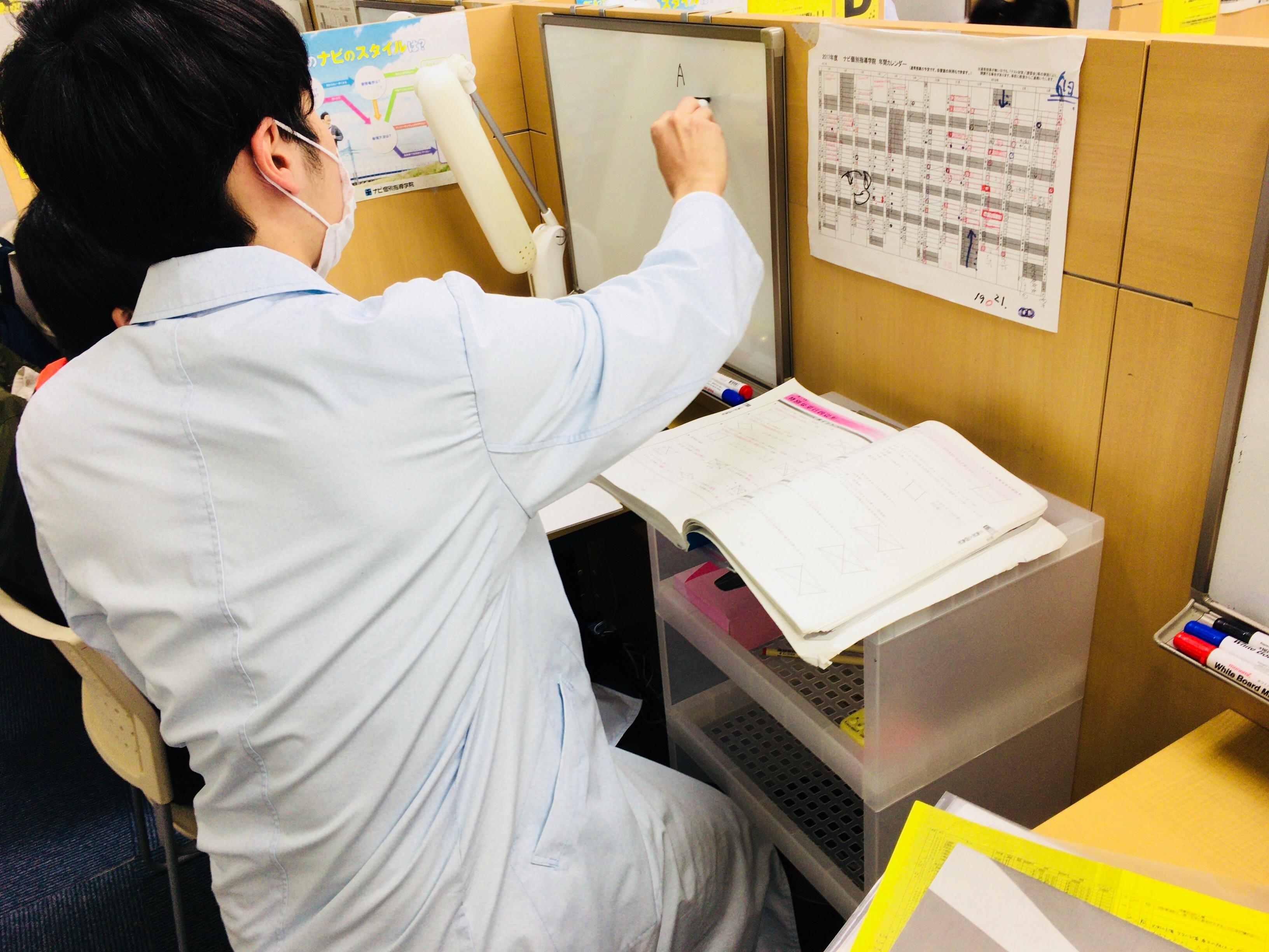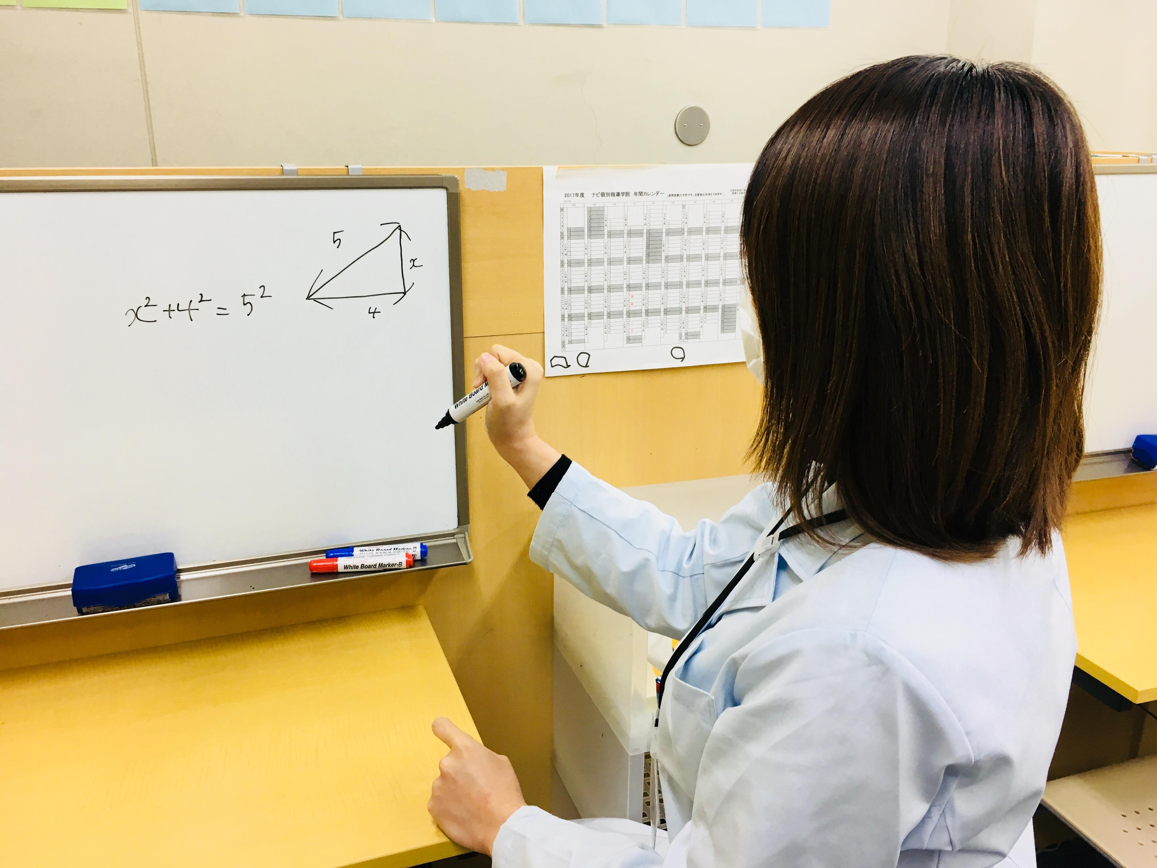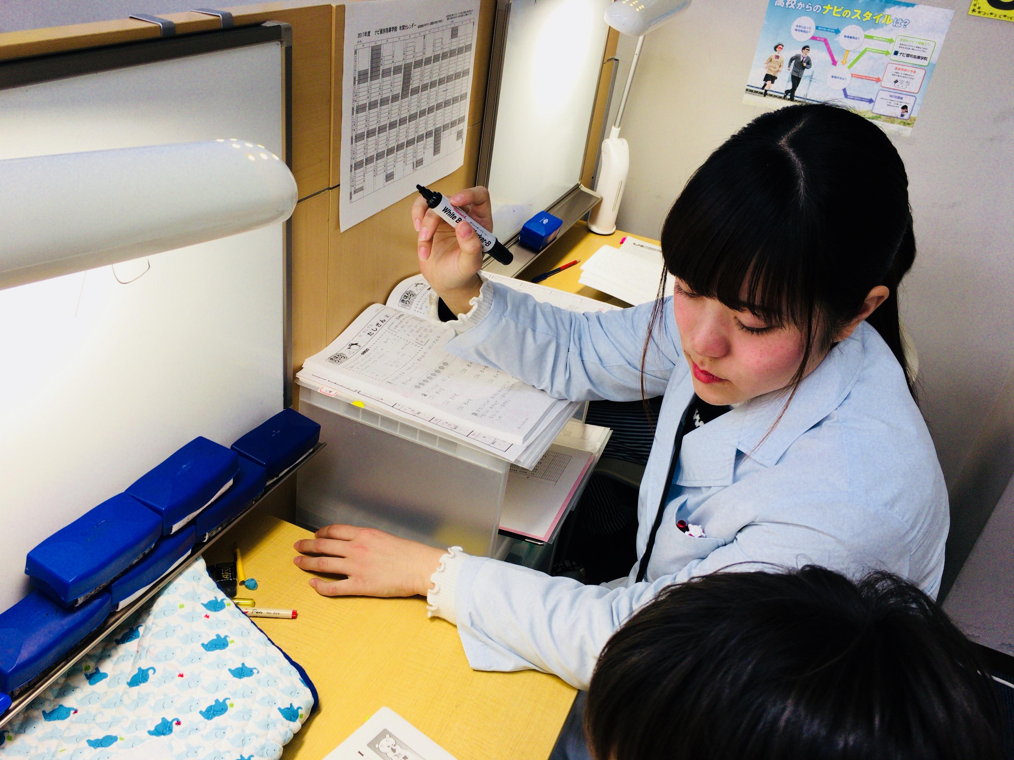 ナビ個別指導学院の授業は、個別の席ごとに設置された自分専用のホワイトボードで解き方や考え方を一緒に確認、それから生徒が問題を解くという「個別授業」スタイルです。