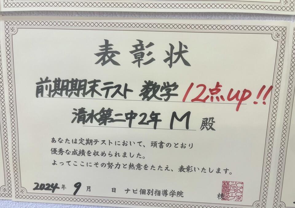今回優秀な成績を収めた生徒さんのご紹介です!★★ 清水第二中2年 Mさん ★★