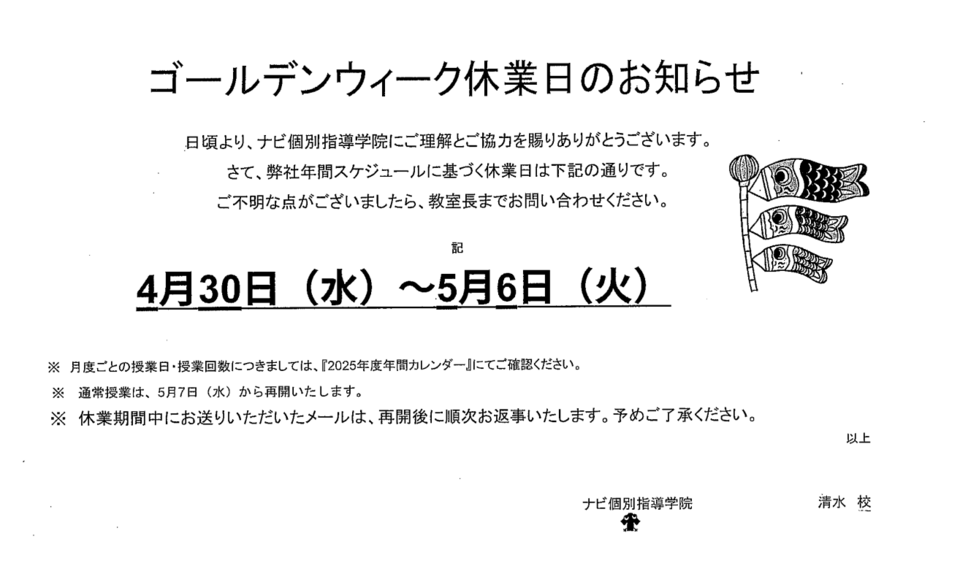 4/30(水)~5/6(火) 授業の再開は5/7(水)からとなります。