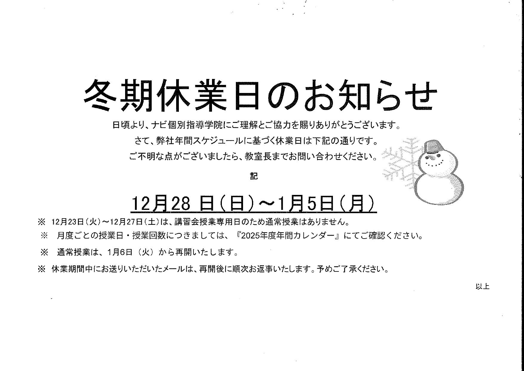 ※12月23日(火)から12月27日(土)に関しましては、冬期講習の為、通常授業はお休みです。
