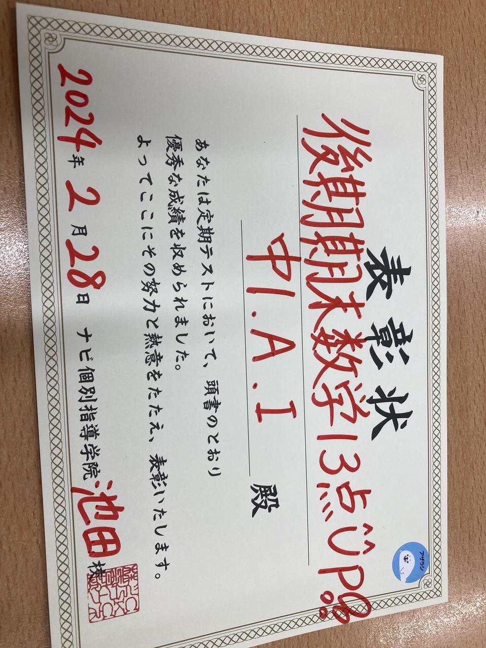定期テスト健闘者(前回より13点UP)♪