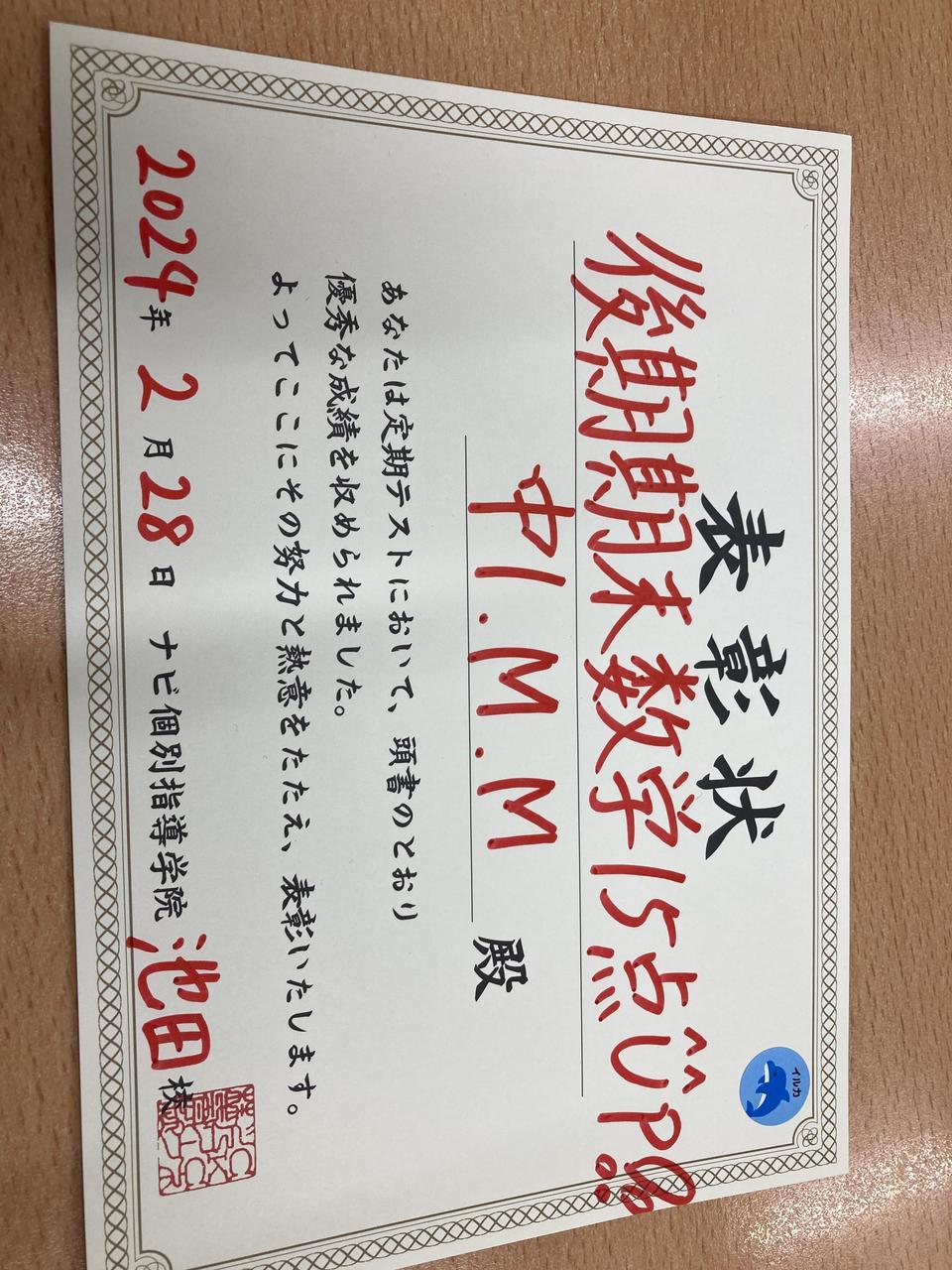定期テスト健闘者(前回より15点UP)♪
