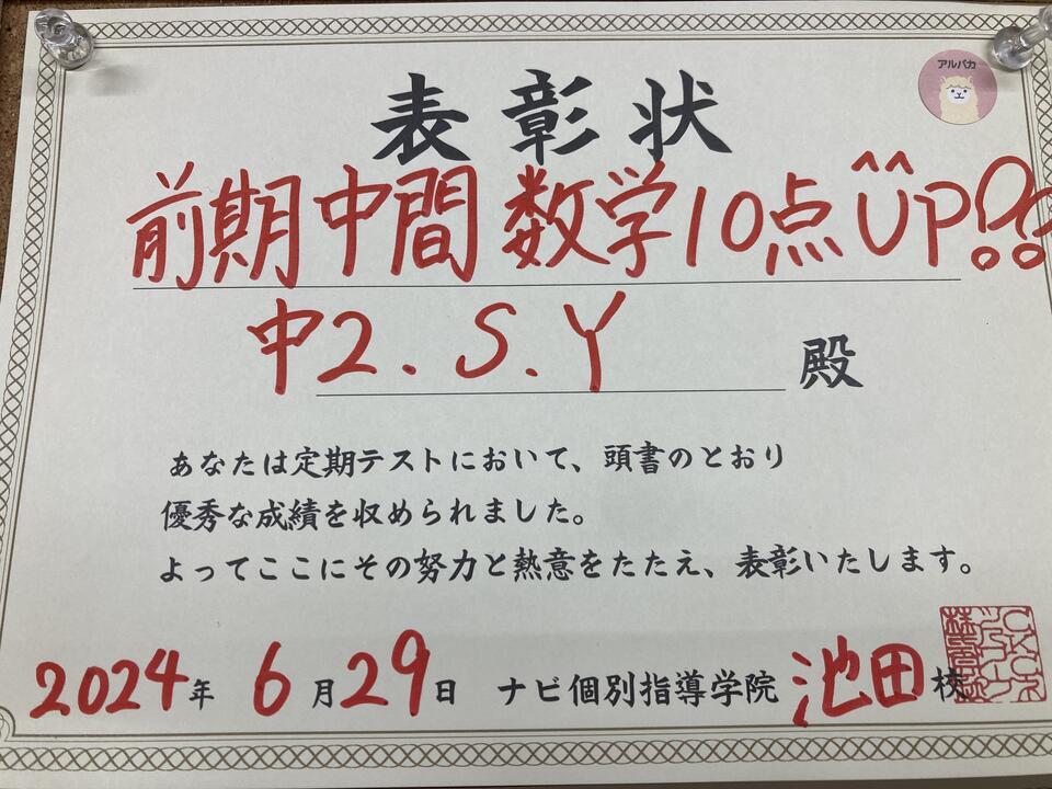 定期テスト健闘者(前回より10点UP)♪