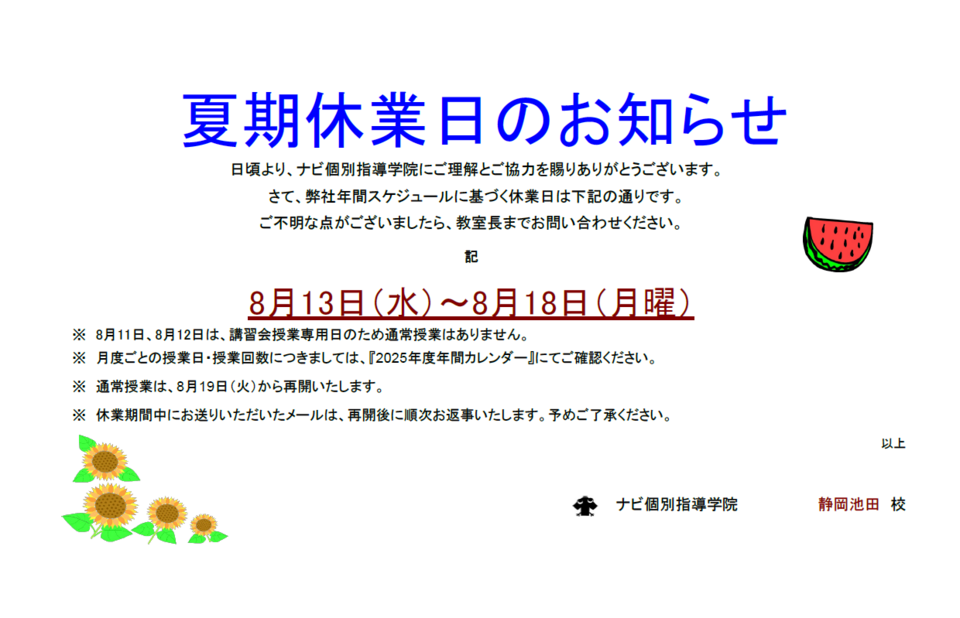 夏期休業日のお知らせです。