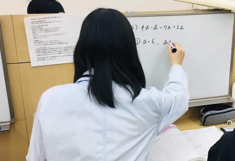 ナビ個別指導学院の授業は、個別の席ごとに設置された自分専用のホワイトボードで解き方や考え方を一緒に確認、それから生徒が問題を解くという「個別授業」スタイルです。
